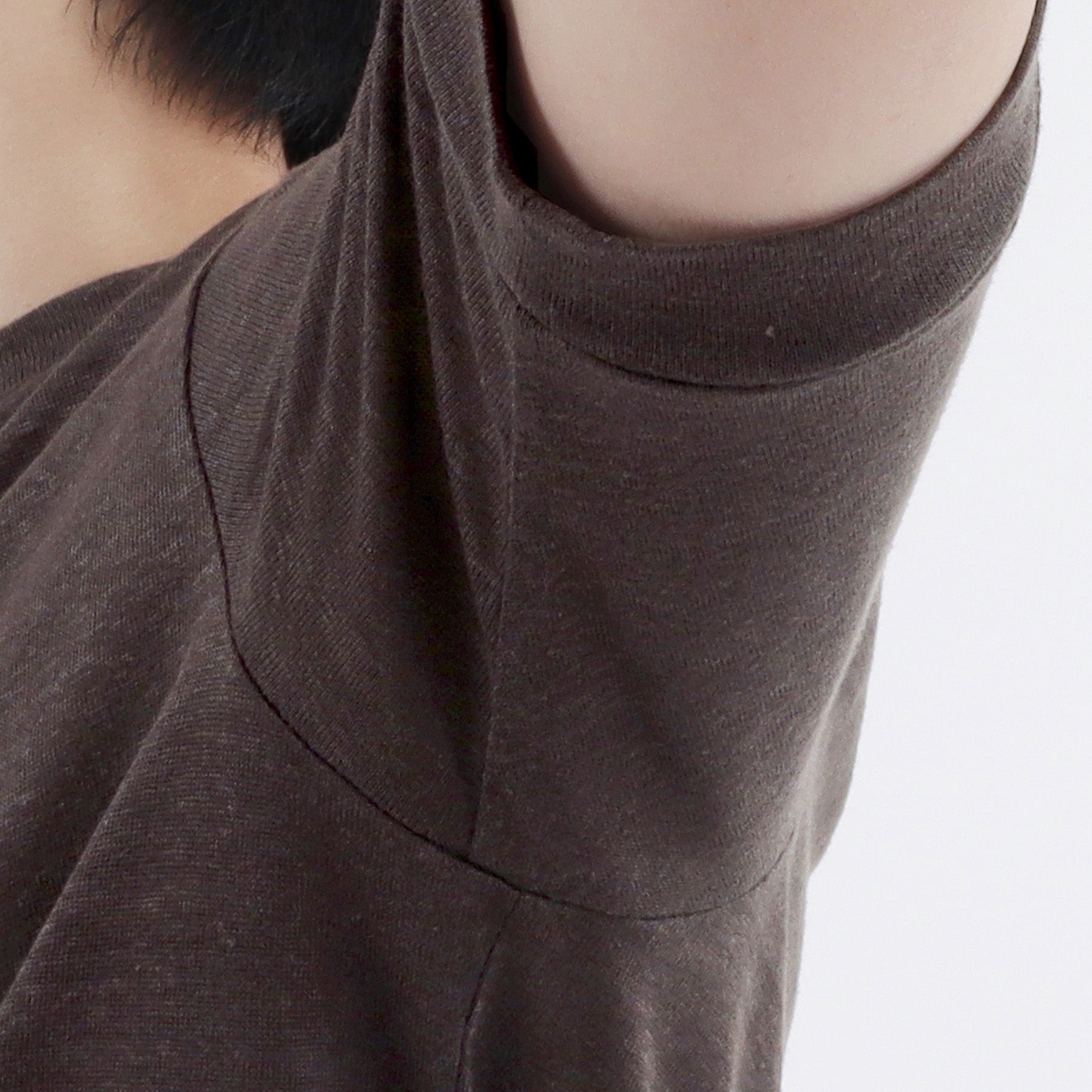 袖口、裾を切り替えてニットのような見え方にしています。Tシャツ以上、ニット未満なアイテムとしてカットソーのイージーさとニットのエレガントさを併せ持ったTシャツになります。腕が前に出しやすいよう立体的に作られたアームホールに対して袖自体を前振りにしています。また肩線をずらし、肩や袖山にイセを入れることで体に沿わせながら可動域を広げる設計にもなっています。左脇には+CLOTHETであることを示す+マークが配色で入っています。