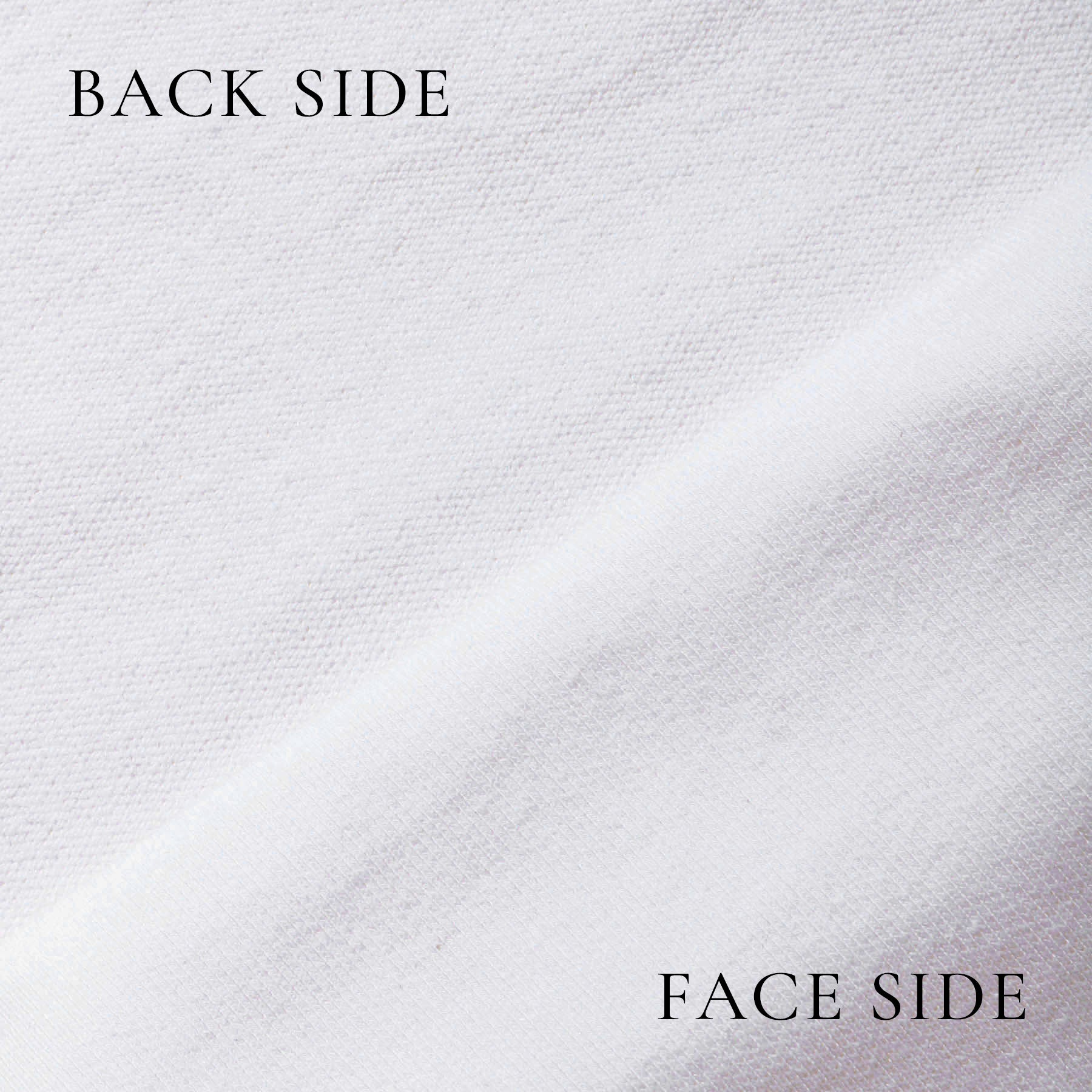 従来は廃棄されていた縫製工場から出る裁断くずを回収し、反毛(はんもう)という特殊な工程を経て、再び新たな糸として生み出された「リサイクルスビン」。その糸を使って裏毛を作成、味わいのある表情の生地が完成しました。ふくらみのある肉感、糸ムラなど凹凸感のある表情はこれまでのスビンプラチナムとは違った雰囲気をもたらしています。