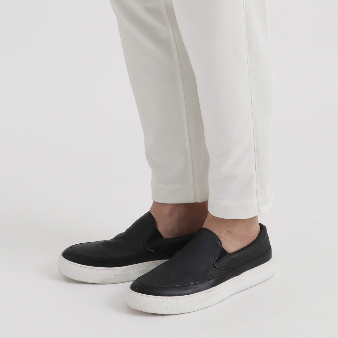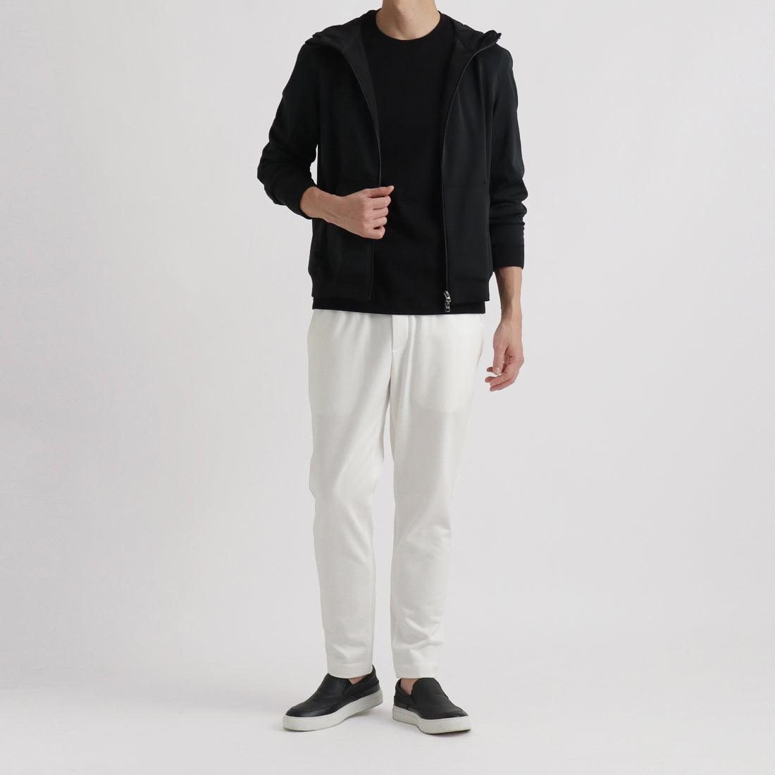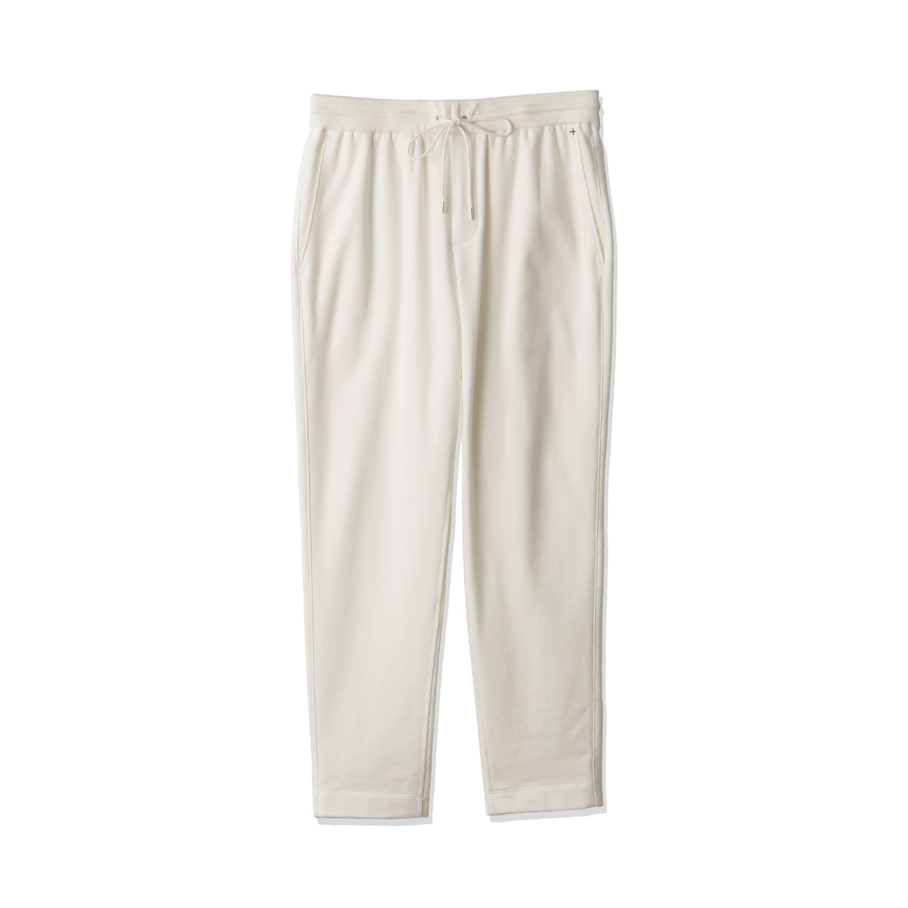 シーズンを問わずに活躍する人気素材「スビンプラチナムスムーステリー」を使ったスウェットパンツが、この春リニューアルを果たしました。なめらかで上品な表面感と着心地の良さ、軽いアウターに最適な肉感で大変好評をいただいてきましたが、見えてきた課題やお客様の声を元に改良を重ね、ついに新型スウェットパンツが完成いたしました。