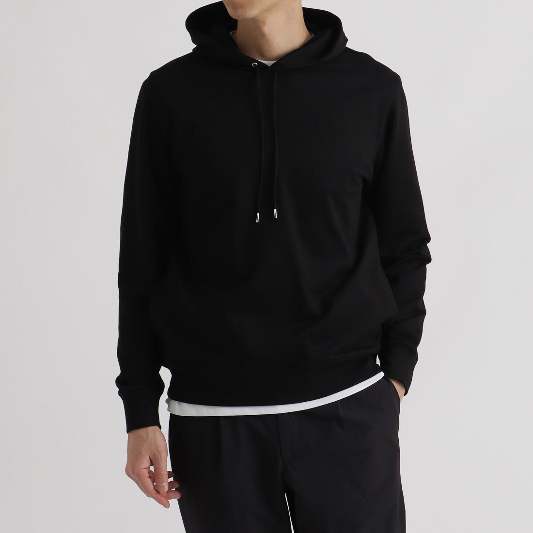 シーズンを問わずに活躍する人気素材「スビンプラチナムスムーステリー」を使ったフーディーが、この春リニューアルを果たしました。なめらかで上品な表面感と着心地の良さ、軽いアウターに最適な肉感で大変好評をいただいてきましたが、見えてきた課題やお客様の声を元に改良を重ね、ついに新型フーディーが完成いたしました。