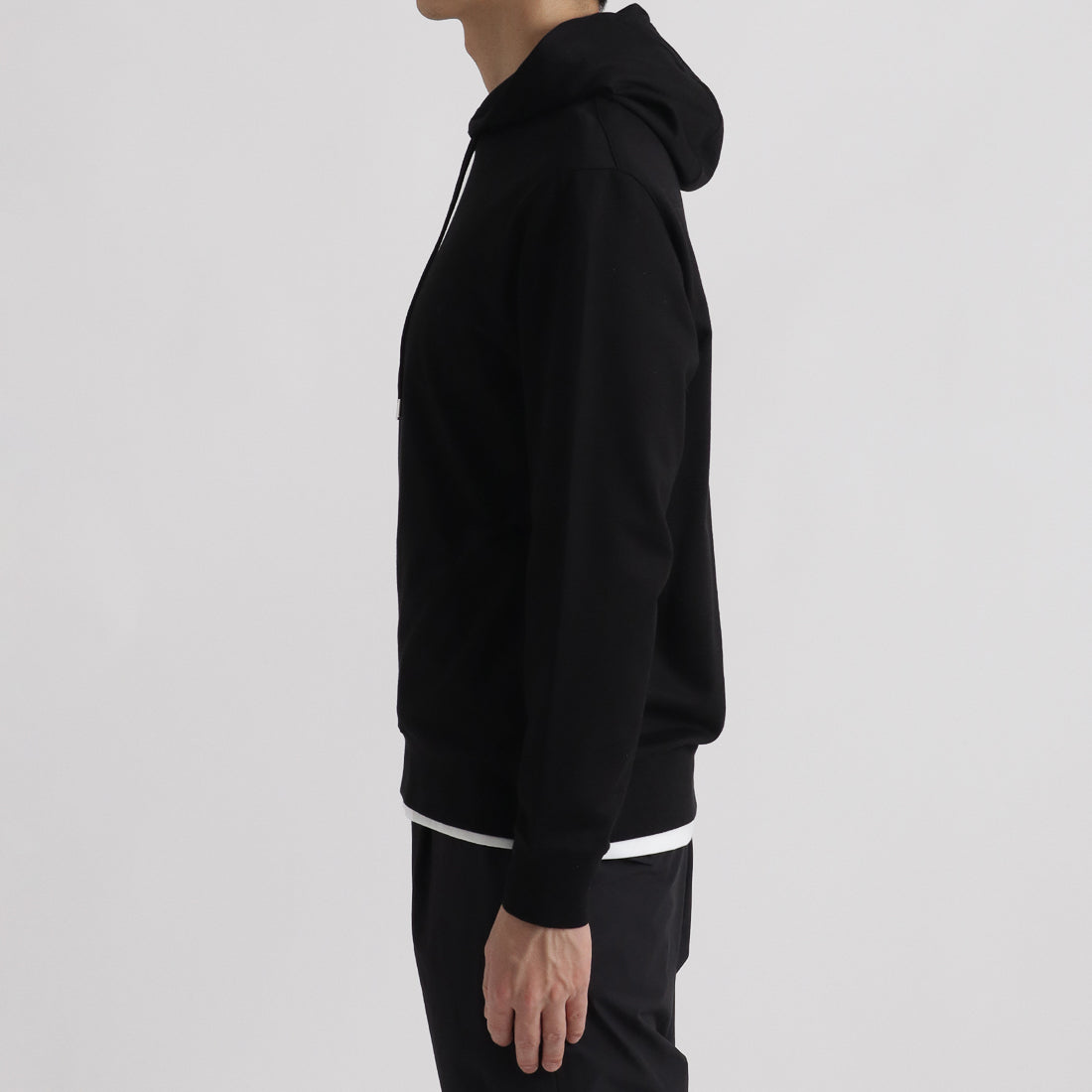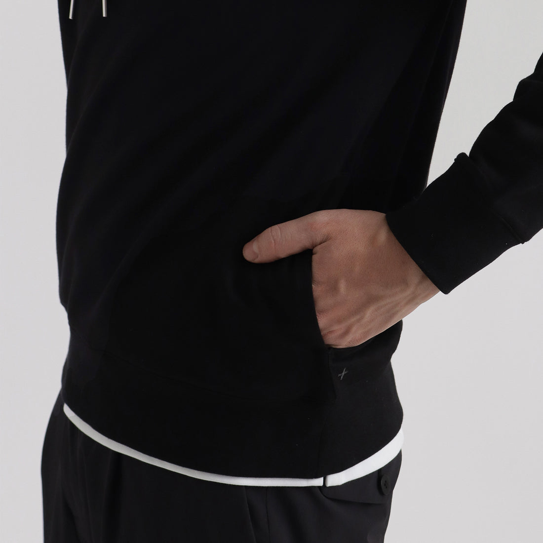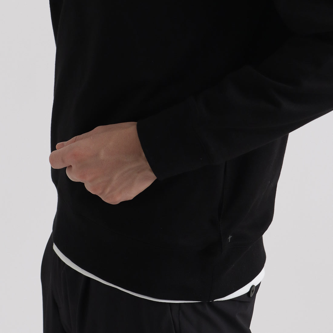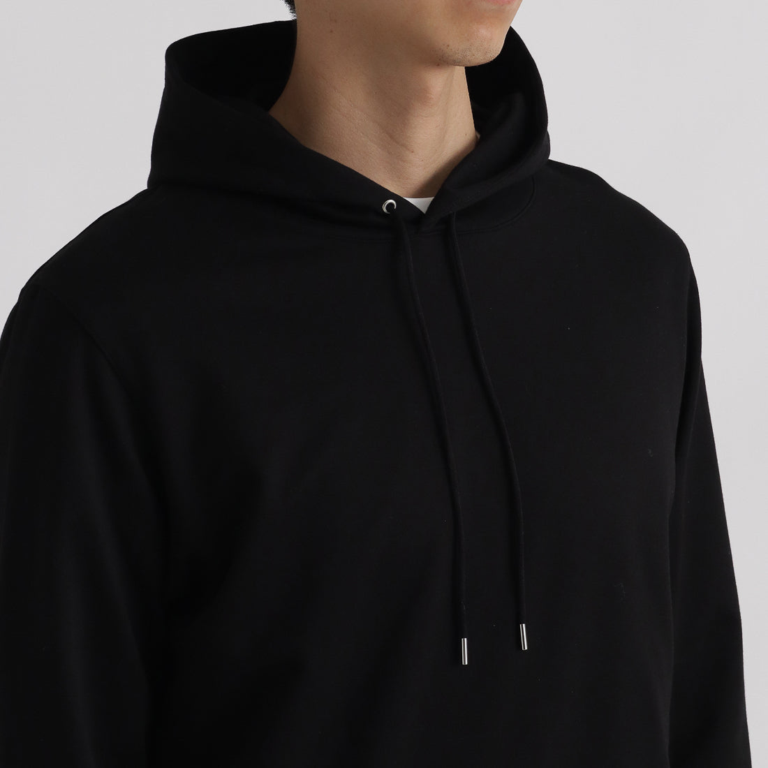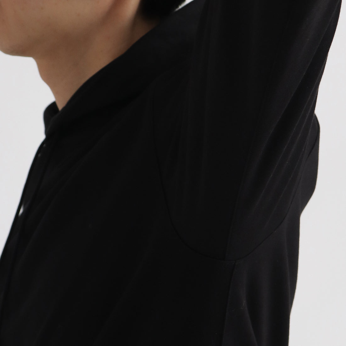 立体的に作られたアームホールに対して袖を前振りに設計。肩線を後にずらし、肩にイセを入れることで体に沿わせながら肩まわりの可動域を広げる設計となっています。フードもしっかりと立つように再度設計を見直しました。裏毛フーディーと同様に全体的にゆとりを持たせたサイズ感、また前身頃より後身頃の着丈を長くすることで身体を包み込むようなシルエットで上品な仕上がりになっています。