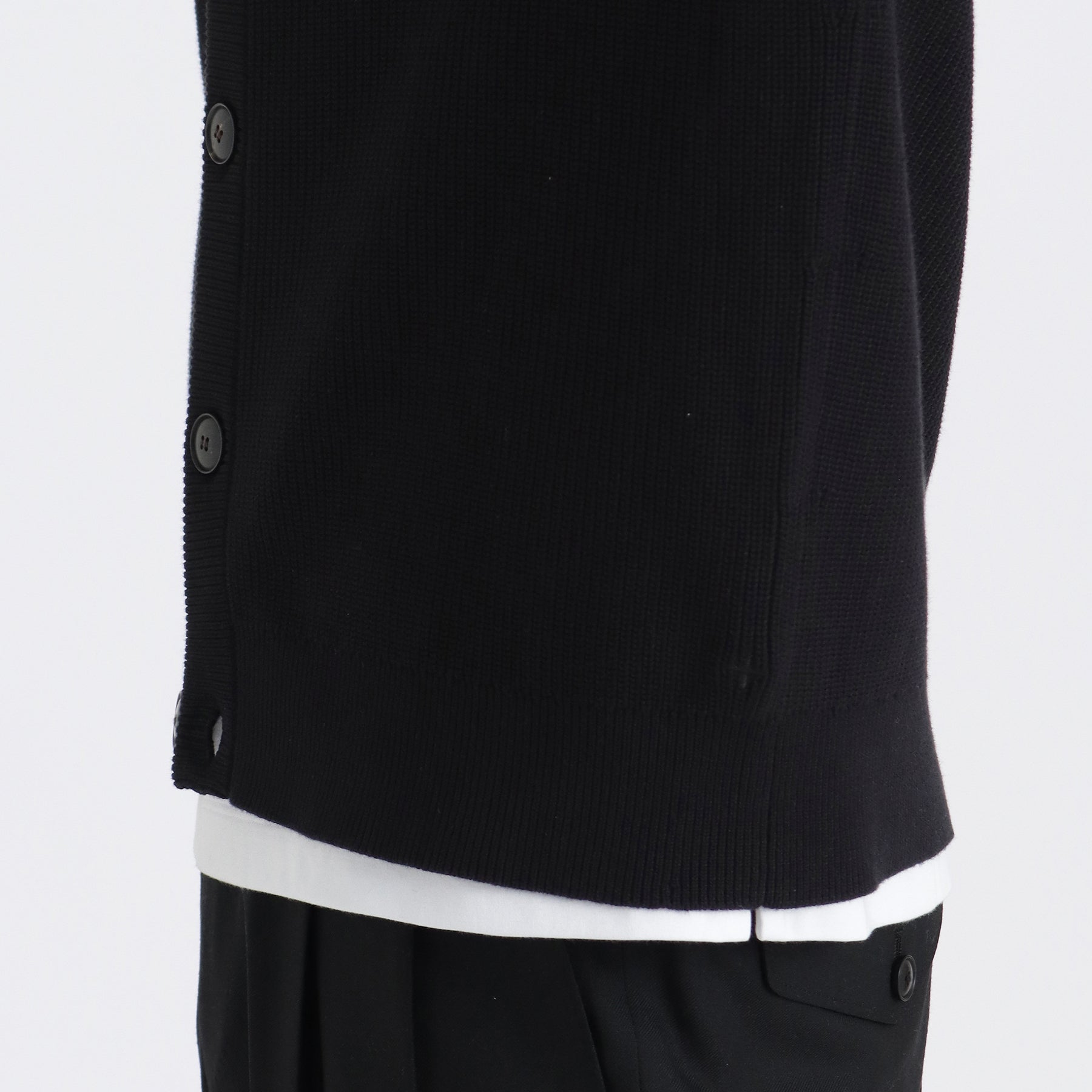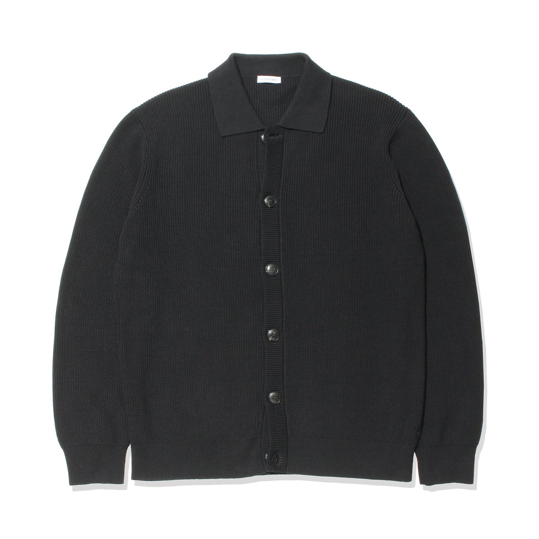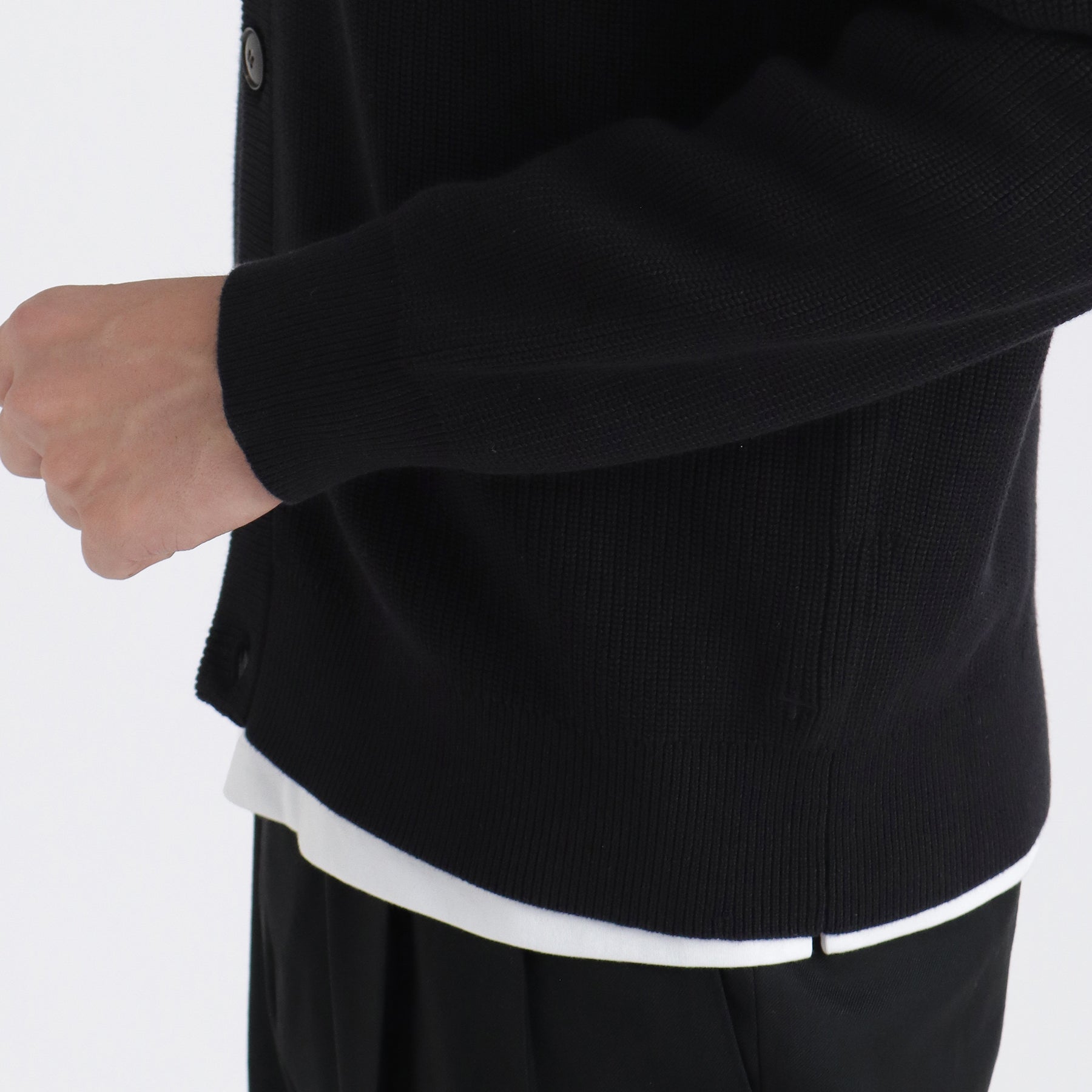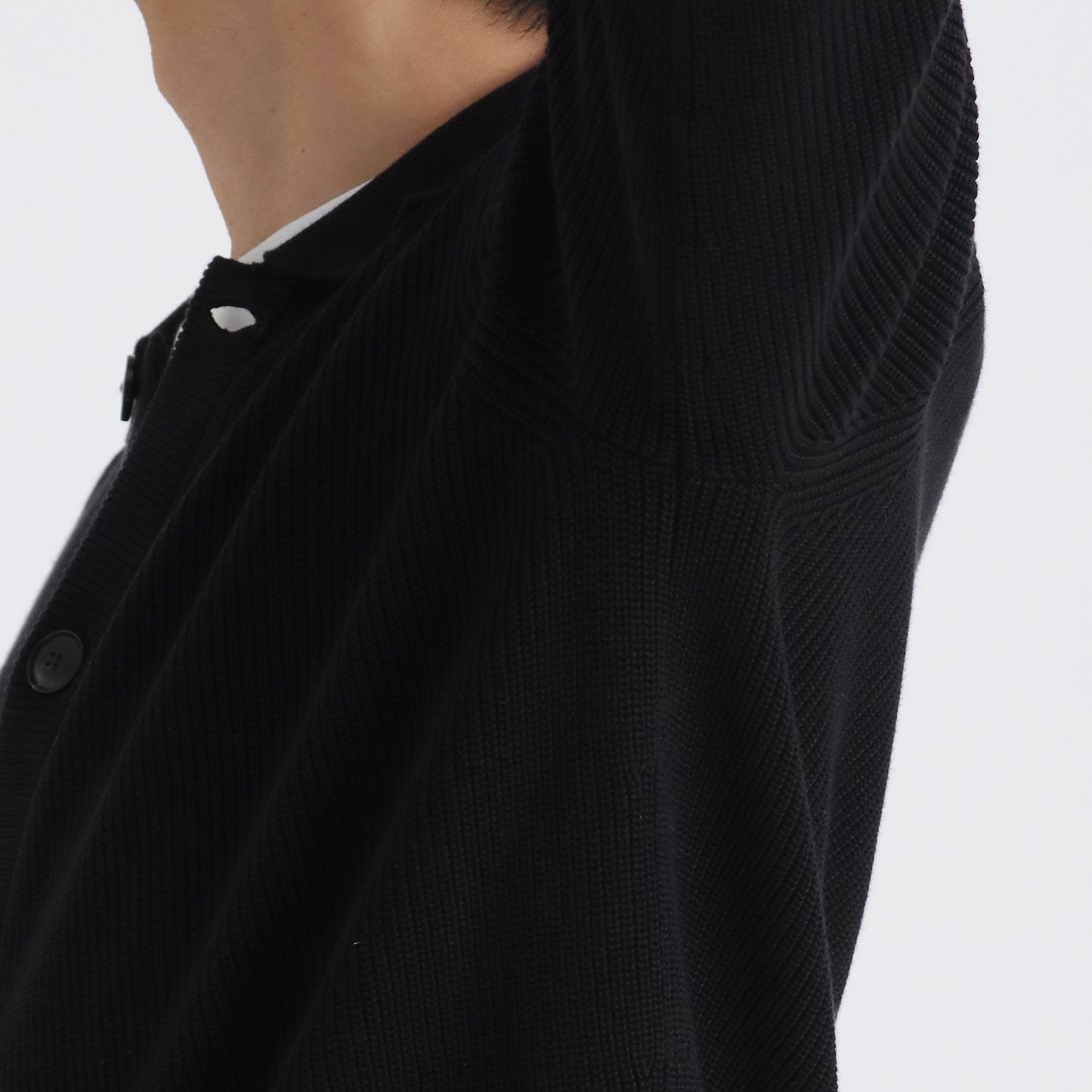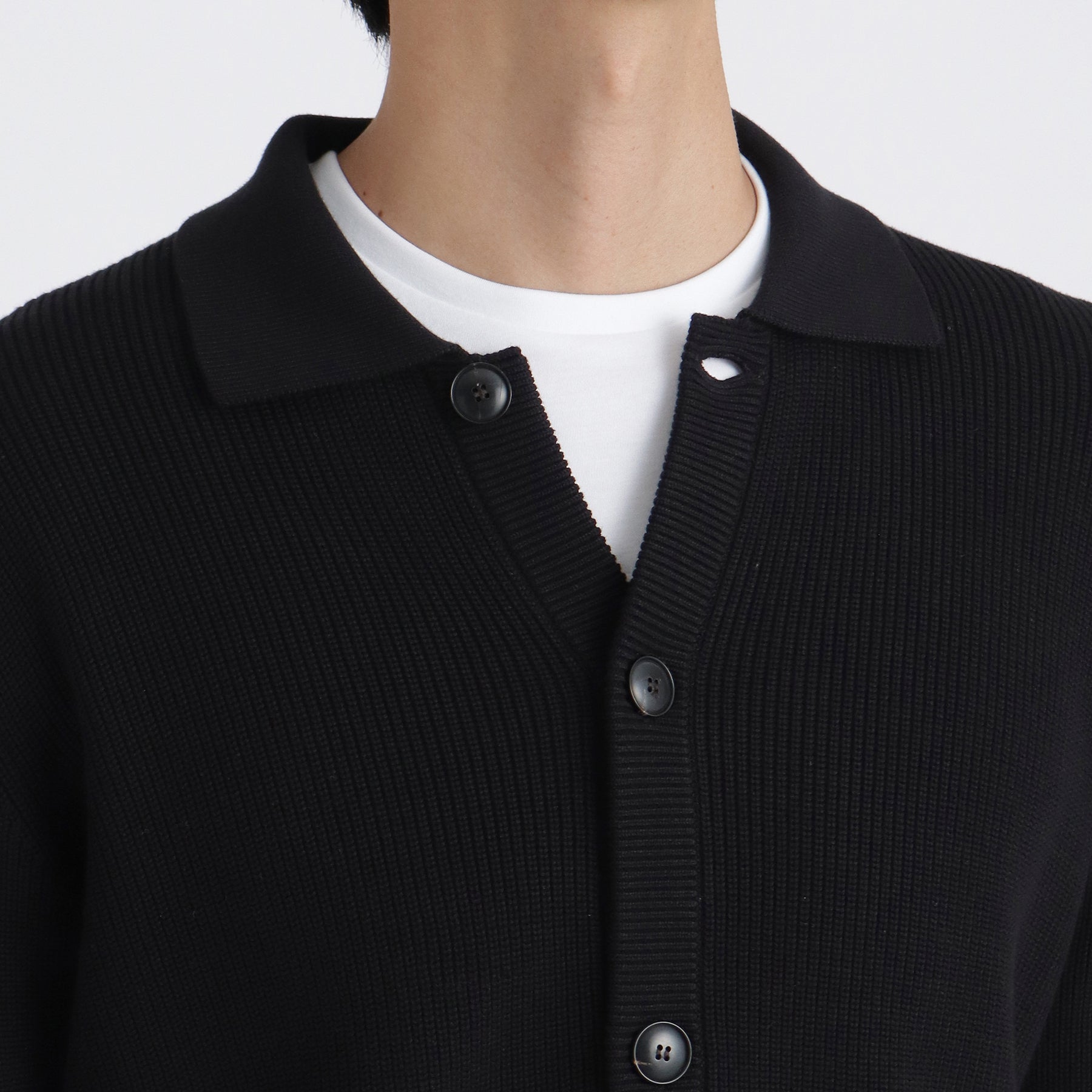 昨シーズン販売開始したスビンプラチナムニットの 新ライン、ミドルゲージコレクション。繊細でなめらかなタッチが人気のスビンプラチナムをミドルゲージ編み機でこれまでにない表面感に作りあげました。アウターとしてもコートなどのインナーとしても着用できる汎用性の高いエリ付きニットカーディガンです。