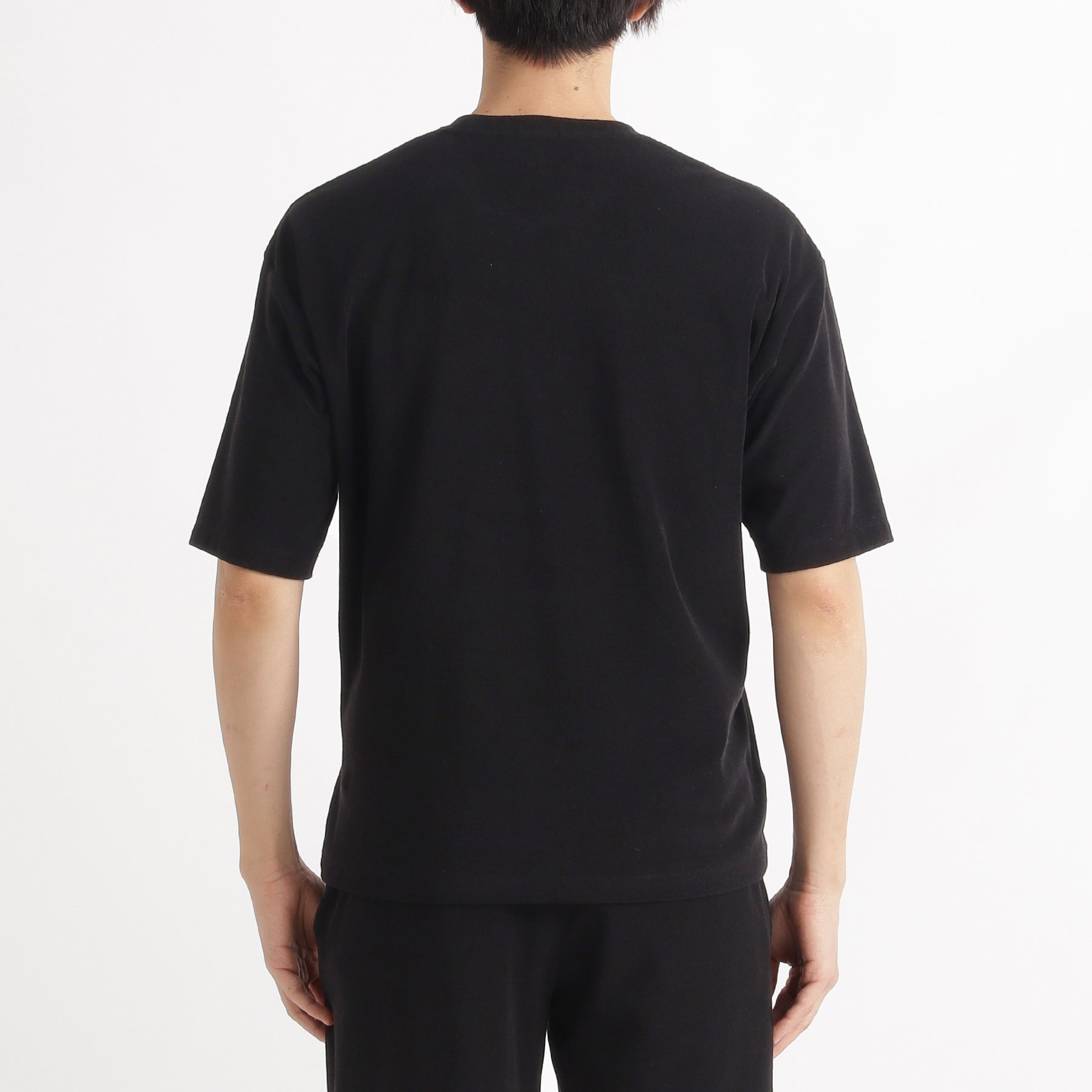 立体的に作られたアームホール形状は残しながらも、イセなどのテーラー要素を無くしたことでテーラードTシャツとは違った着心地に仕上げています。またミドルスウェットシャツと同じサイズ感にすることで外着としてはもちろん、家の中でも着ていただけるアイテムとなっています。左脇スリットには+CLOTHETであることを示す+マークが配色で入っています。
