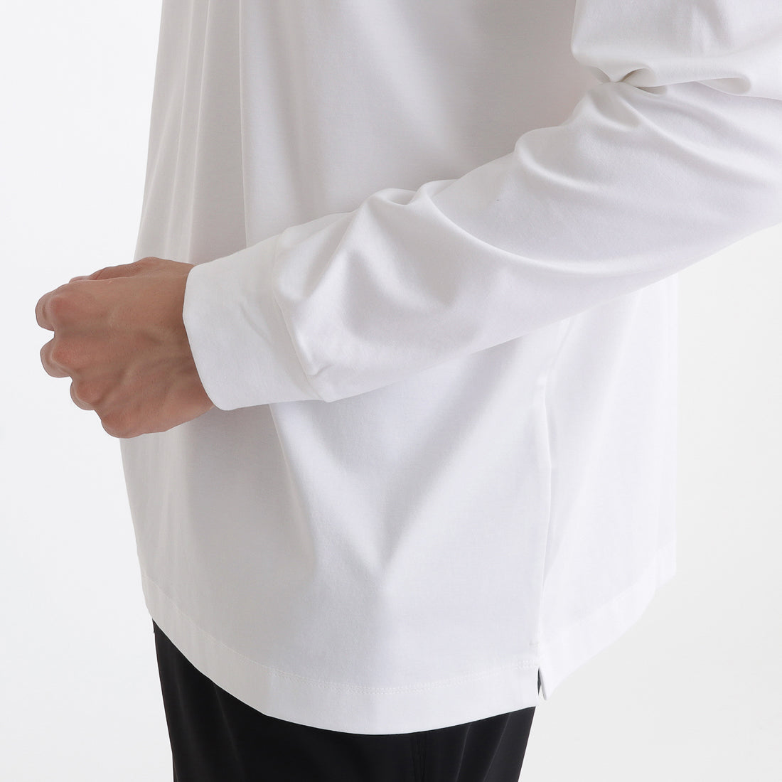 袖をたくし上げることで伸びやすい袖口はリブ仕様を採用することで伸びを軽減。肩から腕にかけて体に馴染むようにパターンを調整することで袖がスッキリと収まるパターン設計にしています。左脇には+CLOTHETであることを示す+マークが同色で入っています。