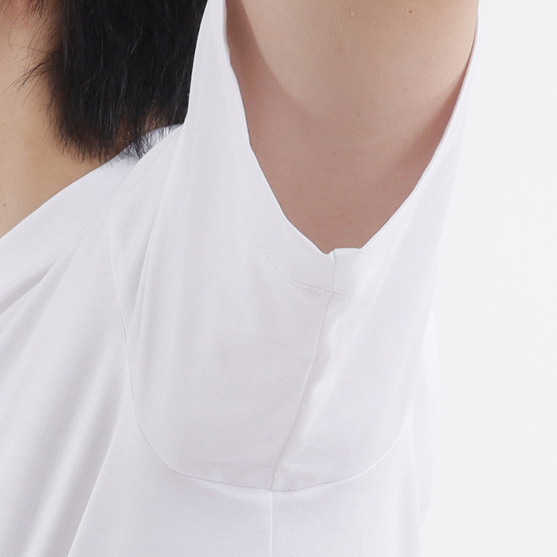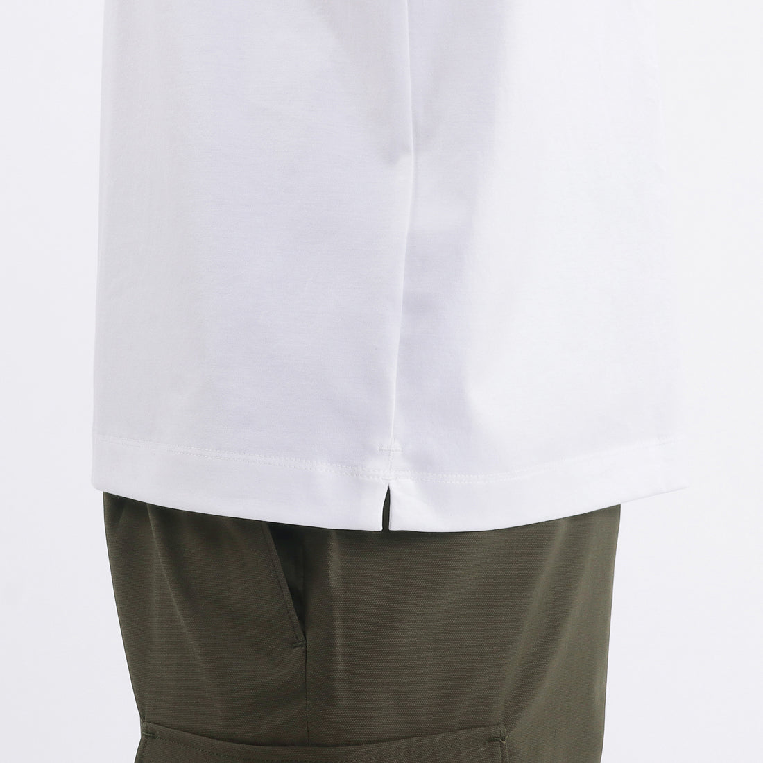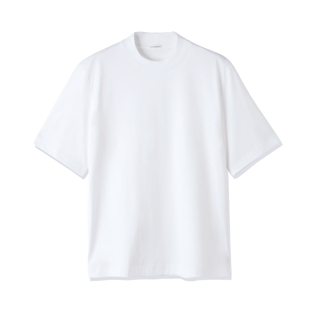 首が長く見えることで小顔に見え、尚且つ締まりすぎないように襟の高さや締まり具合をミリ単位で調整。襟生地にはGIZA45の糸で編まれたフライスを使用しています。シルエットは程よくゆとりのあるリラックスフィットを採用。脇のスリットもステッチが表に出ない袋スリットにしています。左脇には+CLOTHETであることを示す+マークが同色で入っています。