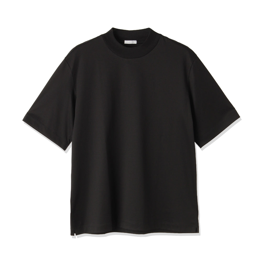 首が長く見えることで小顔に見え、尚且つ締まりすぎないように襟の高さや締まり具合をミリ単位で調整。襟生地にはGIZA45の糸で編まれたフライスを使用しています。シルエットは程よくゆとりのあるリラックスフィットを採用。脇のスリットもステッチが表に出ない袋スリットにしています。左脇には+CLOTHETであることを示す+マークが同色で入っています。