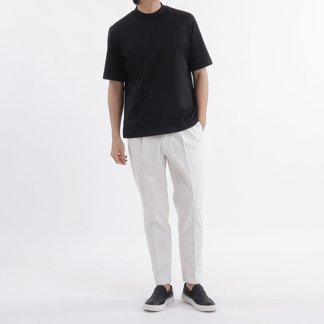 発売開始以来、多くの方からご好評をいただいているエジプト産超長綿の新素材「GIZA45」を使用した新商品、「モックネックドレスTシャツ」が登場しました。 ミリ単位で襟の高さを調整して仕上げた人気のモックネック仕様に、圧倒的な光沢感、ハリコシ、接触冷感性を兼ね備えたGIZA45スムース素材を組み合わせています。