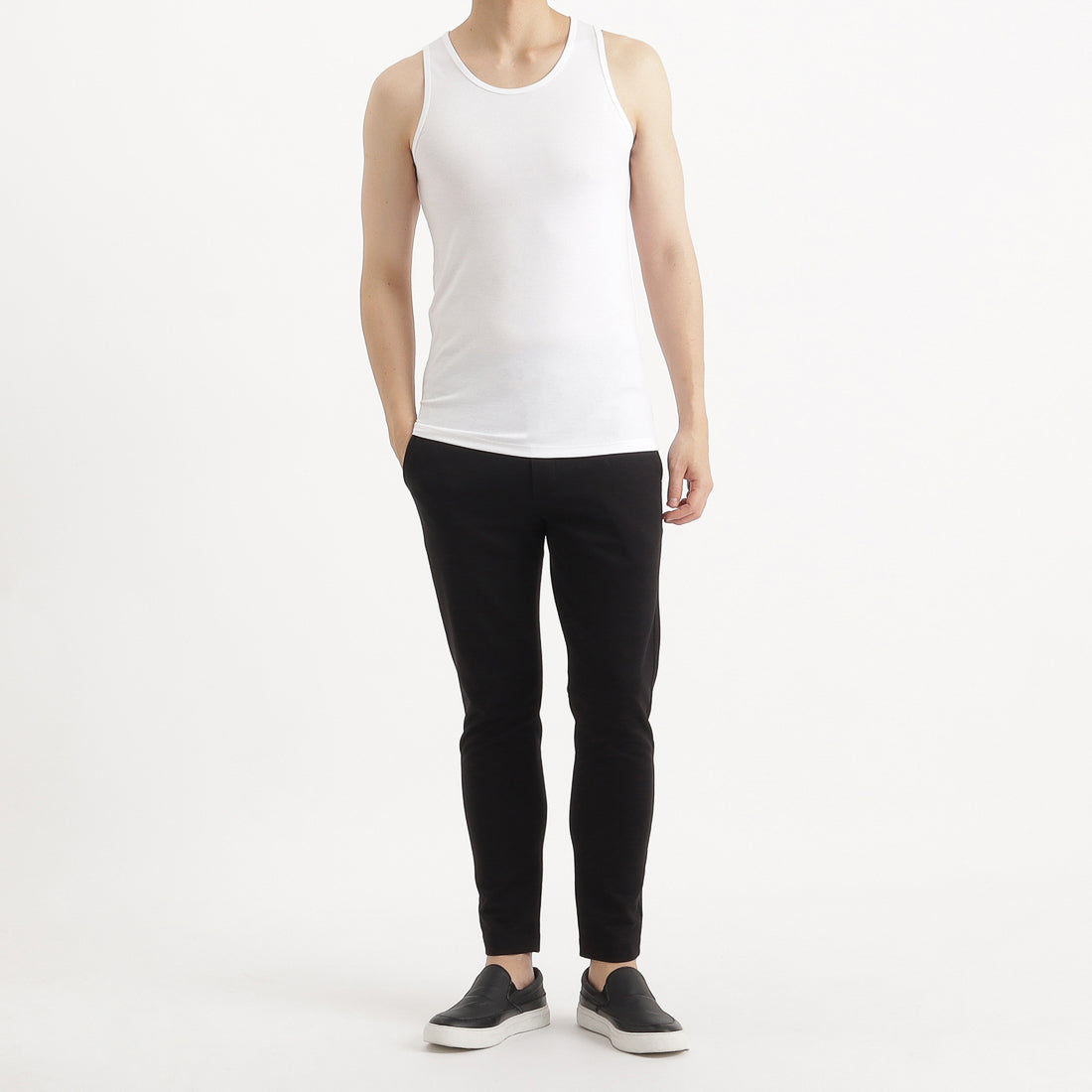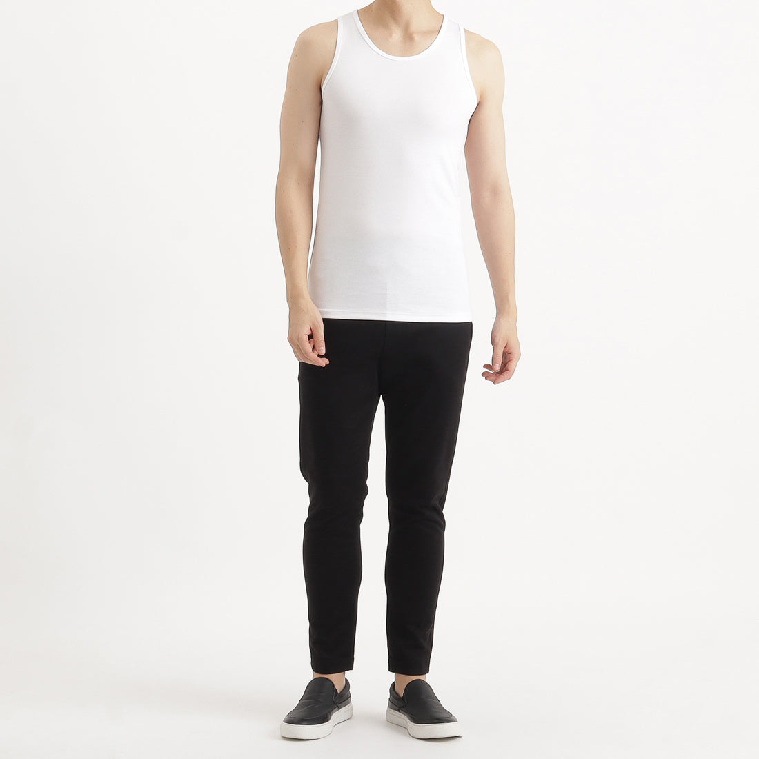 シンプルかつベーシックなタンクトップ。インナーとしてのご着用を想定して、タイトフィットで作成しています。厚すぎない生地感でデイリーユースに活躍する1枚。肩や脇の縫い代をつぶすことで肌当たりをよくしています。左脇には+CLOTHETであることを示す+マークが配色で入っています。