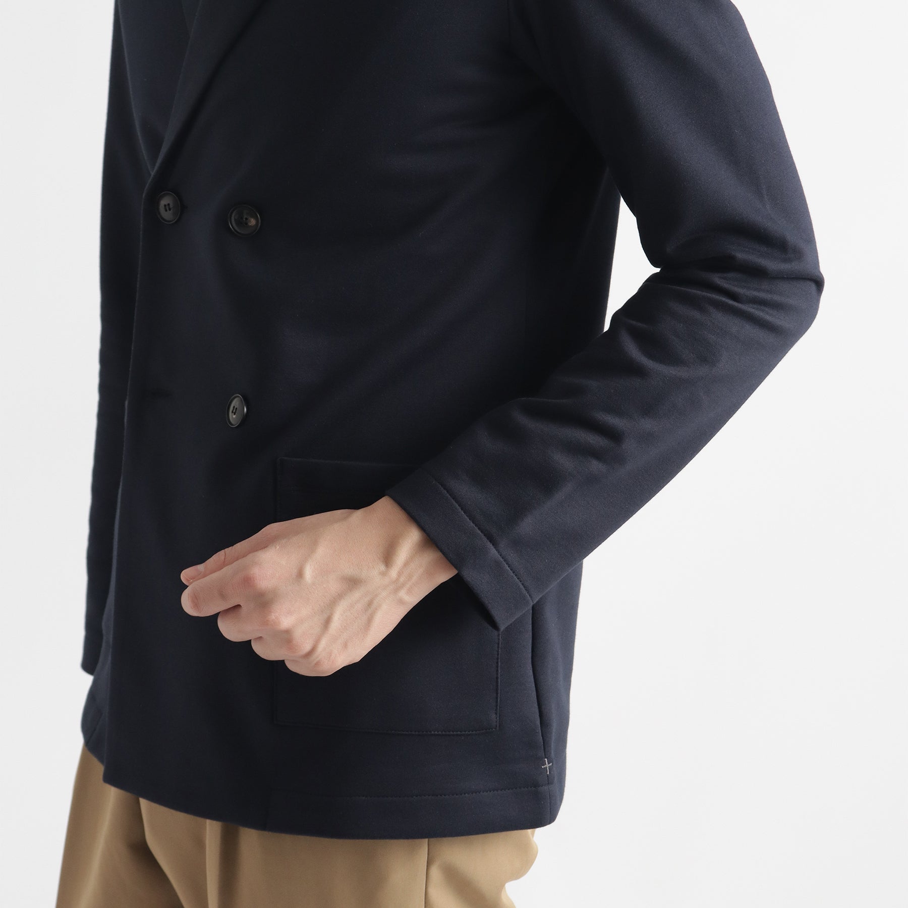 同素材で展開しているスウェットパンツやジョガーパンツとセットアップで着ることができます。左脇には+CLOTHETであることを示す+マークが入っています。
