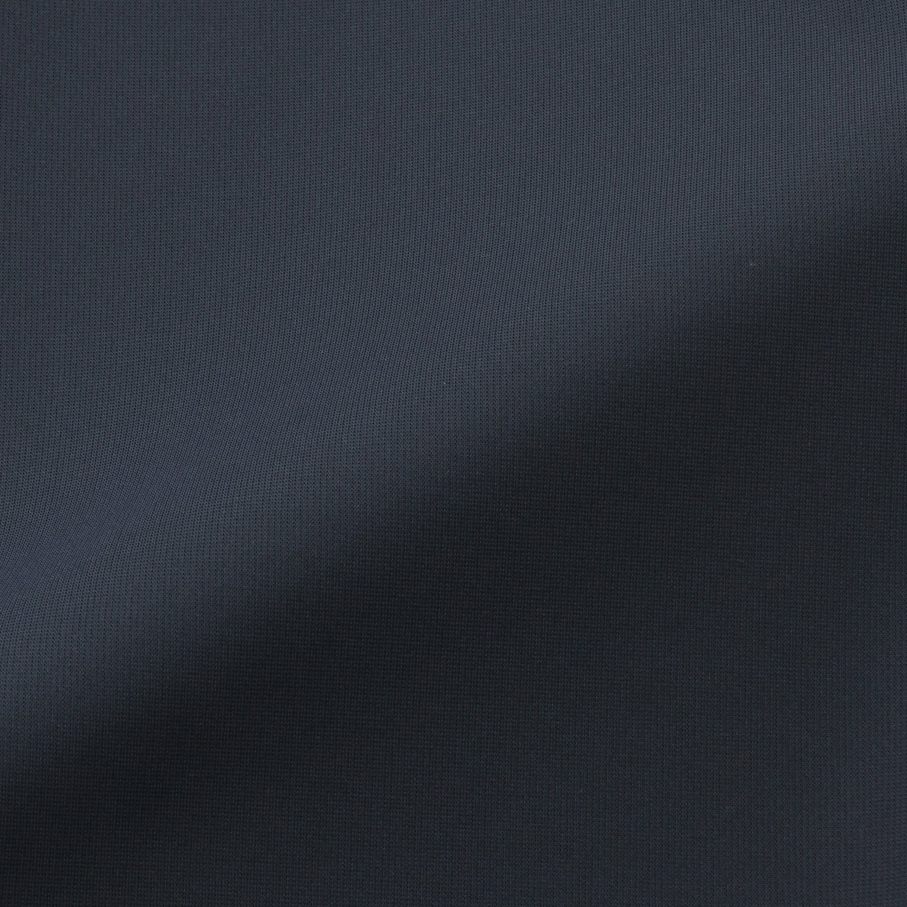 撚糸回数を極限まで上げたポリエステル糸を使用。編み機の調整によって度目を詰めて織物のような表面感とハリ感を実現しました。さらにポリウレタン糸を組み合わせることで、キックバック性にもすぐれたシワになりにくい素材です。