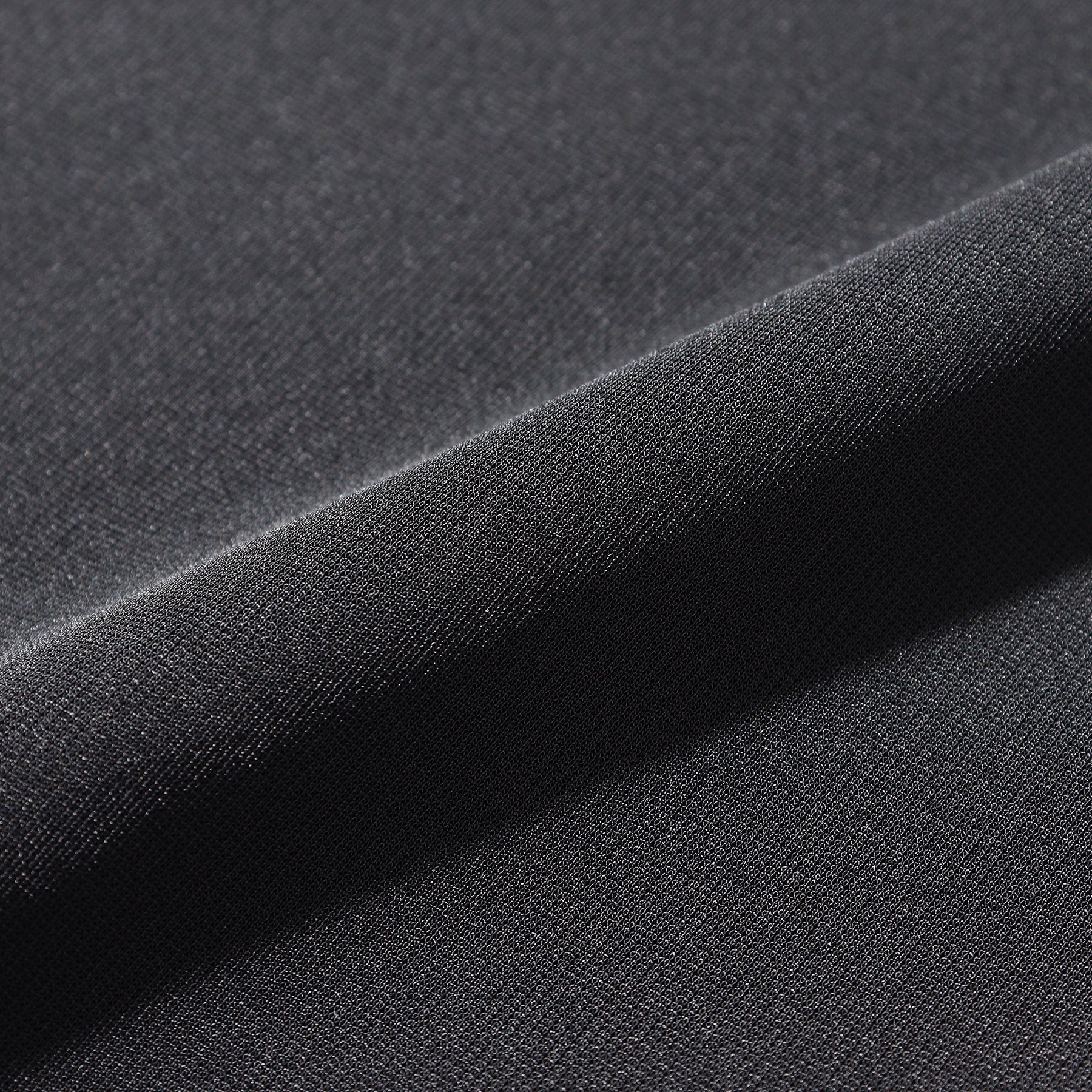 撚糸回数を極限まで上げたポリエステル糸を使用。編み機の調整によって度目を詰めて織物のような表面感とハリ感を実現しました。さらにポリウレタン糸を組み合わせることで、キックバック性にもすぐれたシワになりにくい素材です。