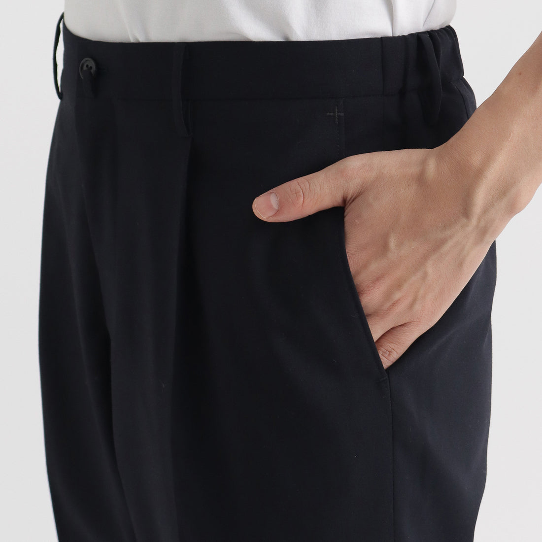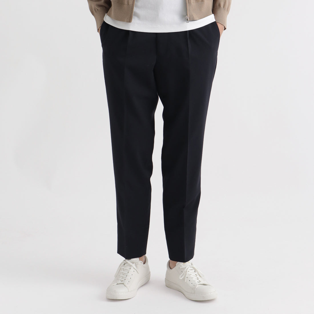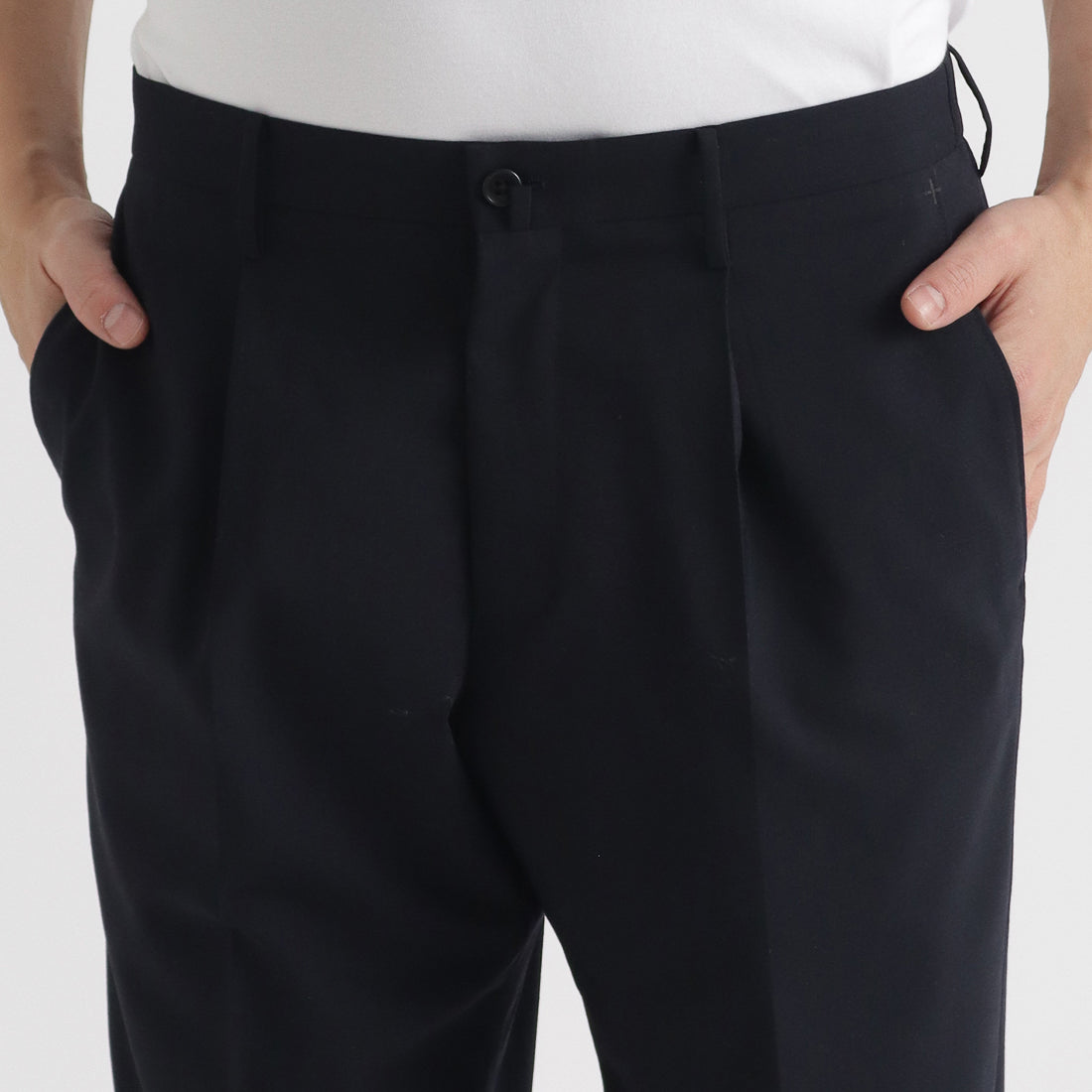 ウールベースの高機能素材「TECHWOOL®」シリーズの細番手ポリエステルウールトロピカルを使用したワンプリーツトラウザーです。