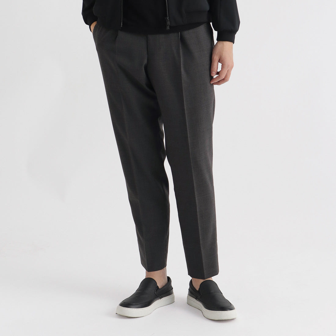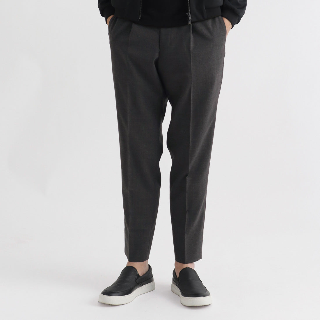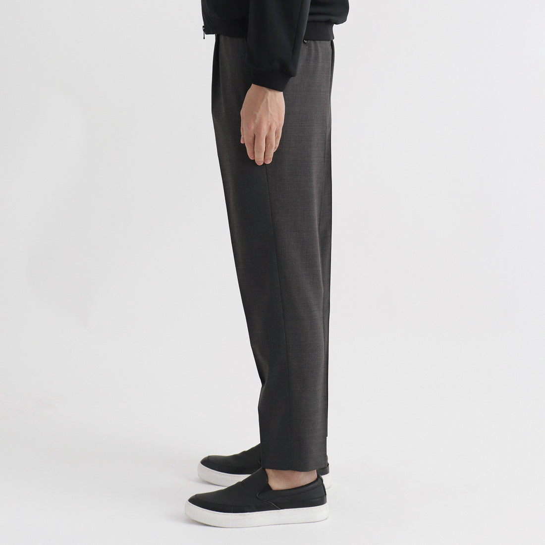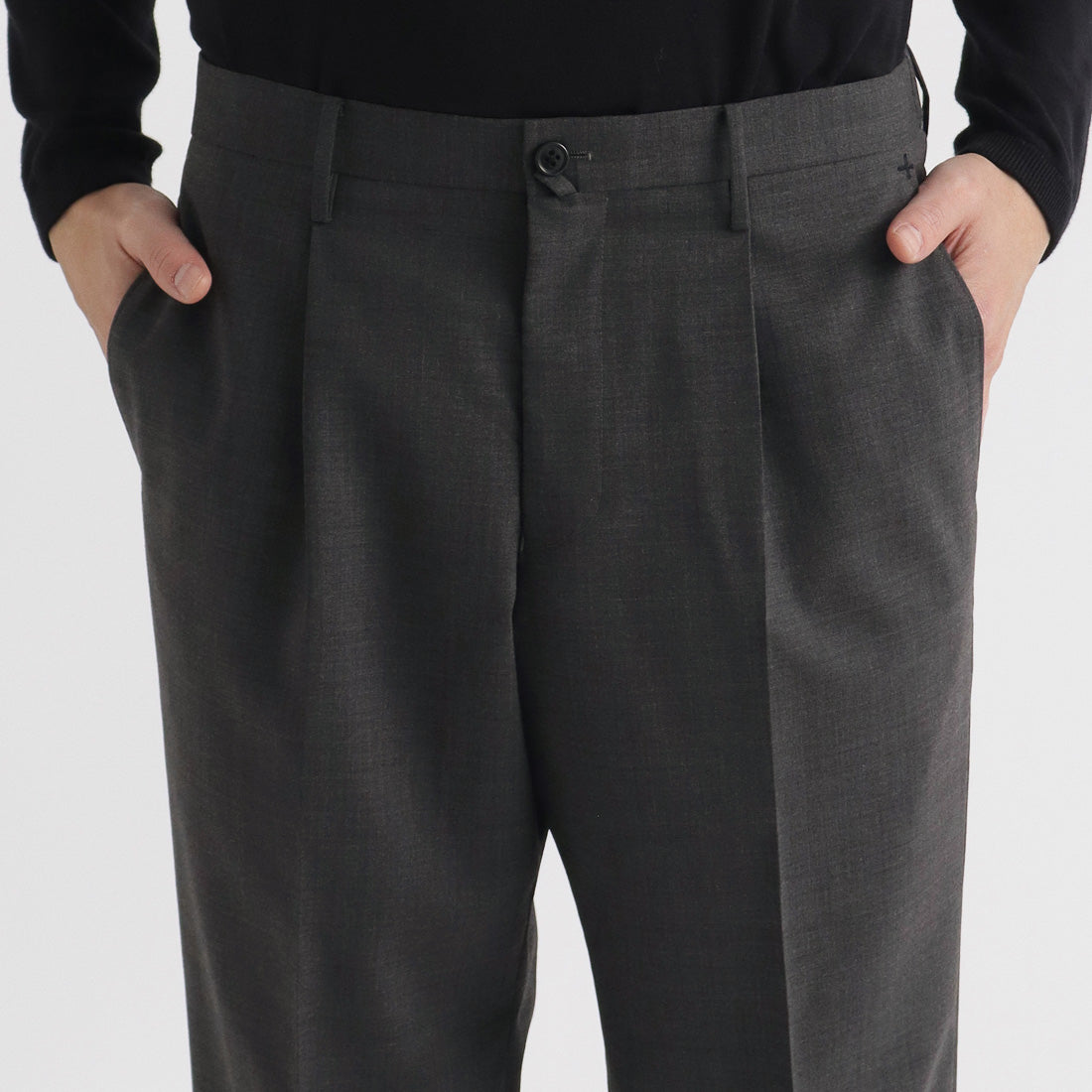 ウールベースの高機能素材「TECHWOOL®」シリーズの細番手ポリエステルウールトロピカルを使用したワンプリーツトラウザーです。