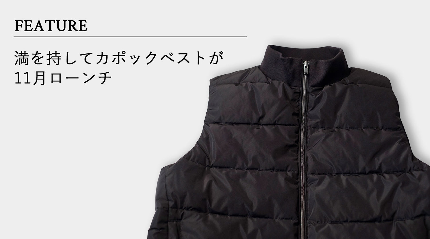 植物由来の繊維「カポック」のワタを使ったベストです。繊維内部の約8割が中空であることによる保温性など「原料の良さを最大限に引き出したい」という想いから、カポックワタをブレンドやシート状にして使うのではなく直接衣服に充填して商品化を目指しました。