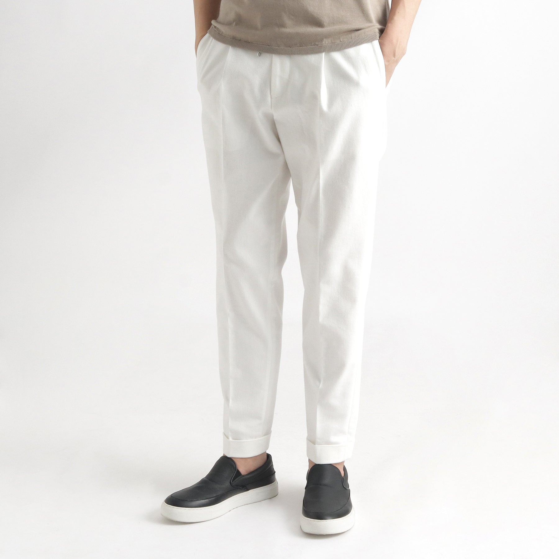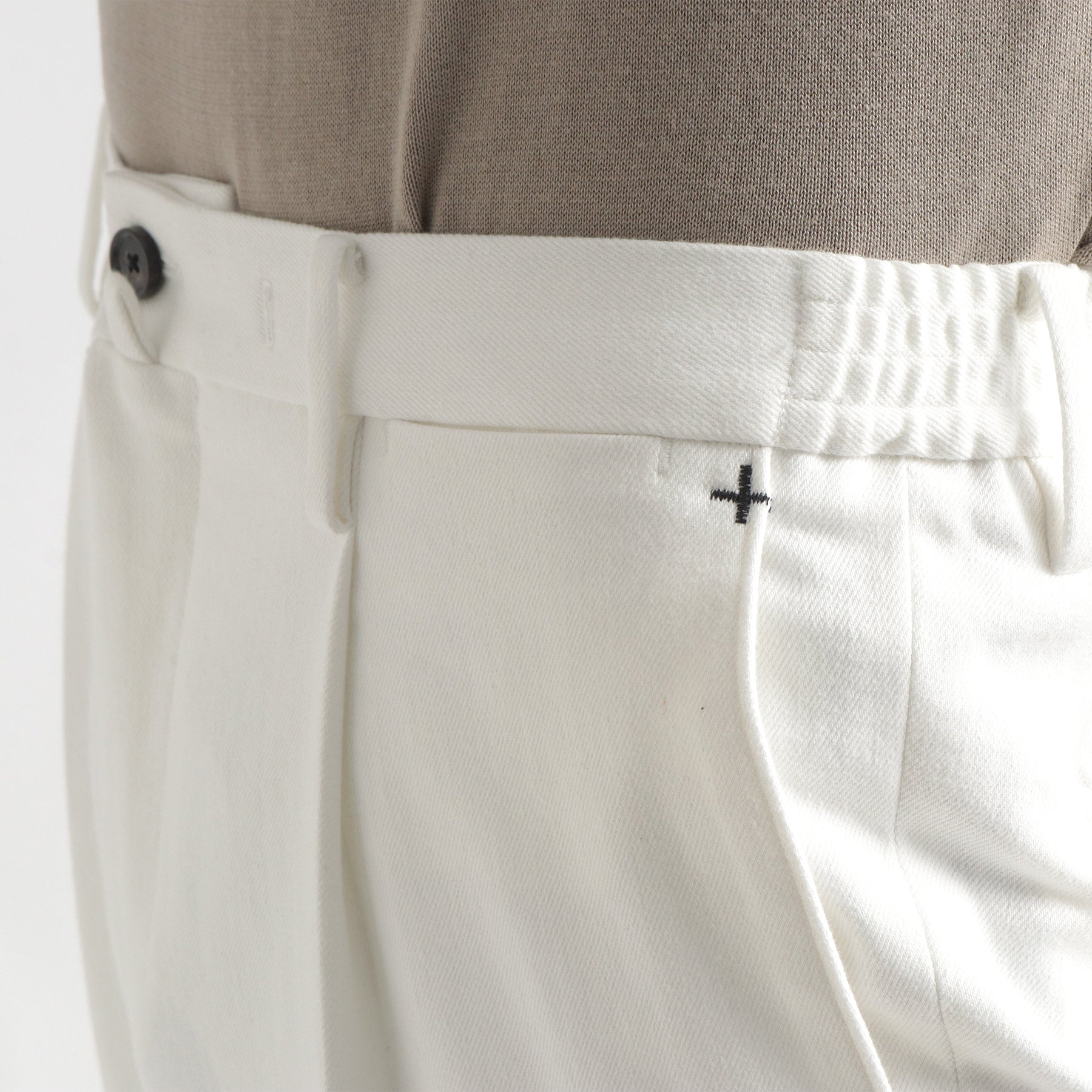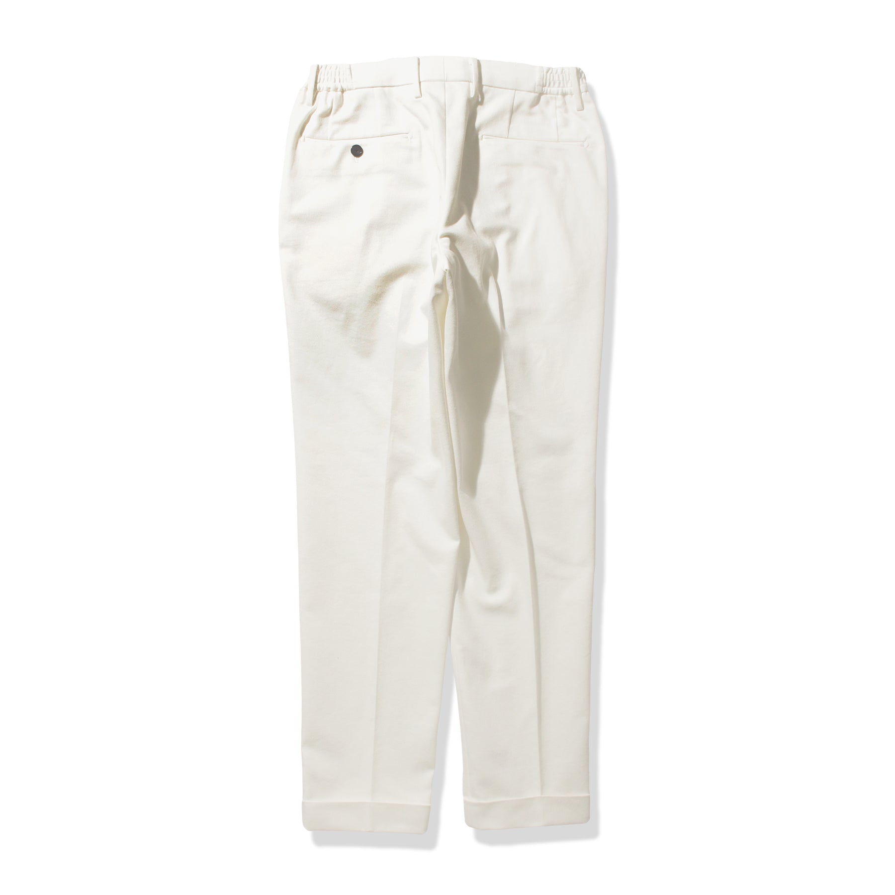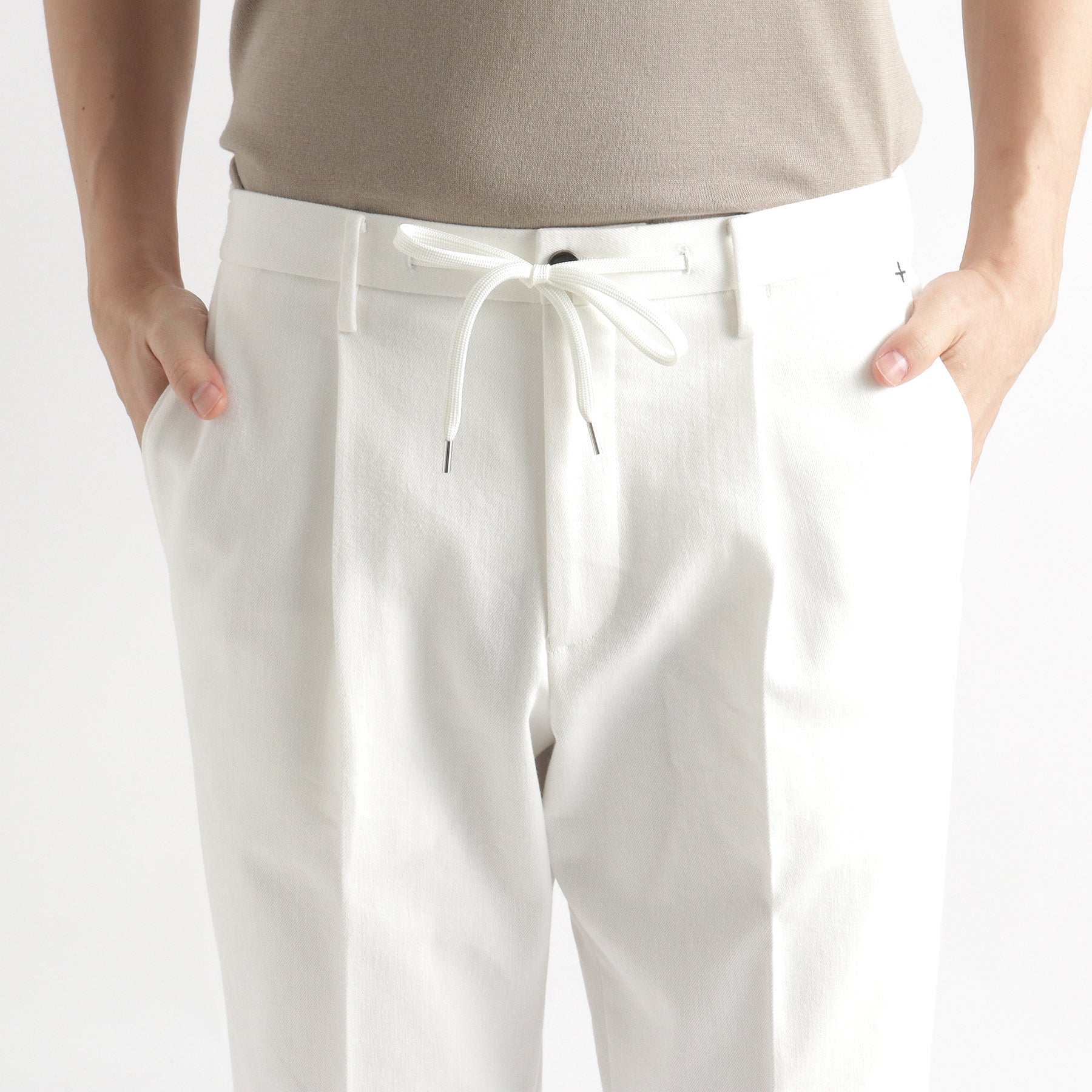 股の部分にくる生地の“前身の形状”と股の部分にくる“後身の長さと高さ”を変更し、前後の生地の長さを完全に同寸にしたことで動きやすさは従来のままで股の部分のたるみがなくなり、きれいな仕上がりになりました。ウエストを絞るコードは外側だけでなく内側にも収納することができるため、シーンに応じて変化させることができます。ウエストゴムも両サイドにのみに使用していますので、ベルトを通すことで一見するとイージー仕様であることが分からないようになっています。後ポケットも3mm幅の細玉縁ポケットで作り上げておりドレッシーな仕上がりに。左ポケットには+CLOTHETであることを示す+マークが入っています。