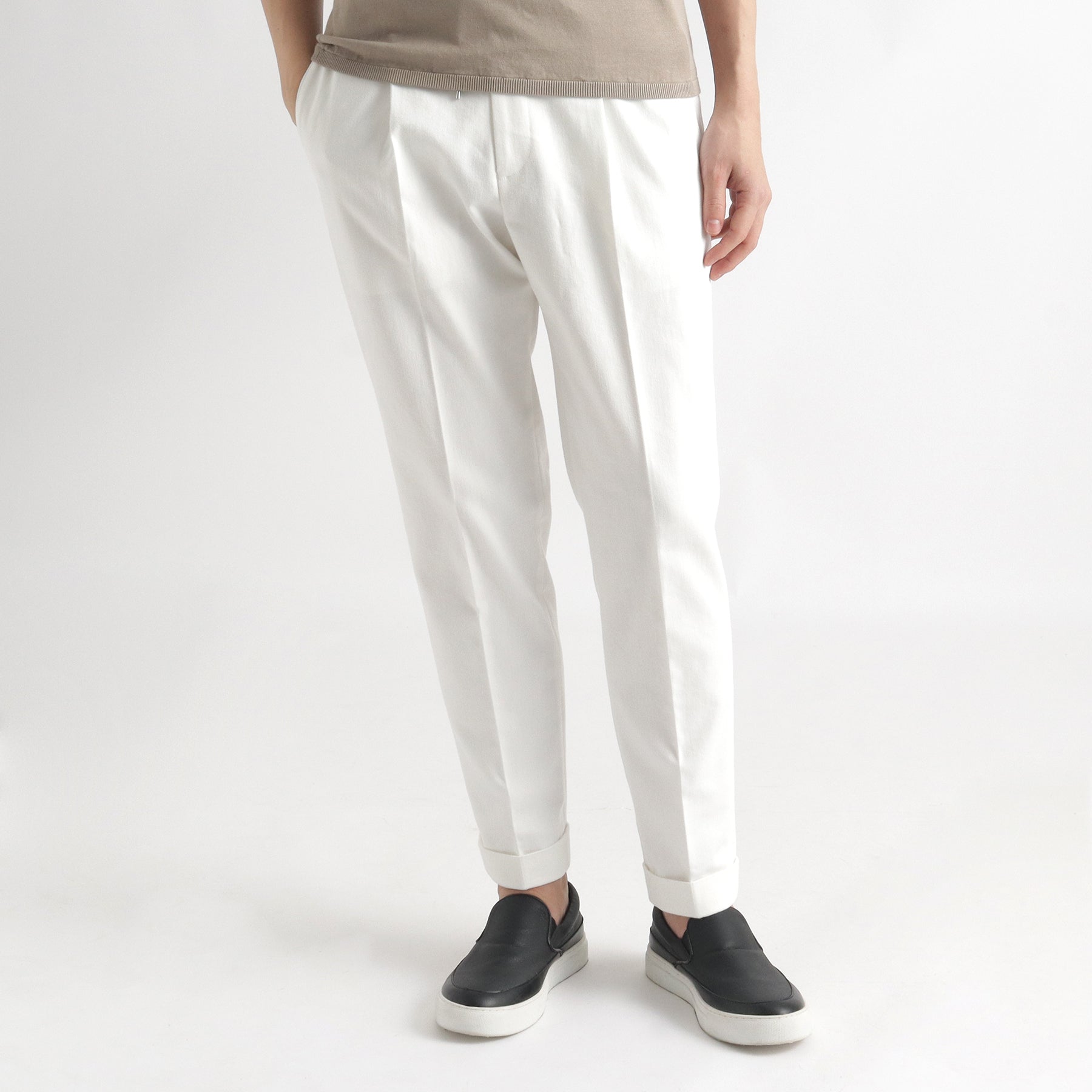 “日本人が似合う、穿きやすくカッコいいトラウザーズをつくる”というコンセプトのもと、骨格、筋肉の付き方など、人体の構造や生活のクセなどを考えた型紙は自身の真骨頂。