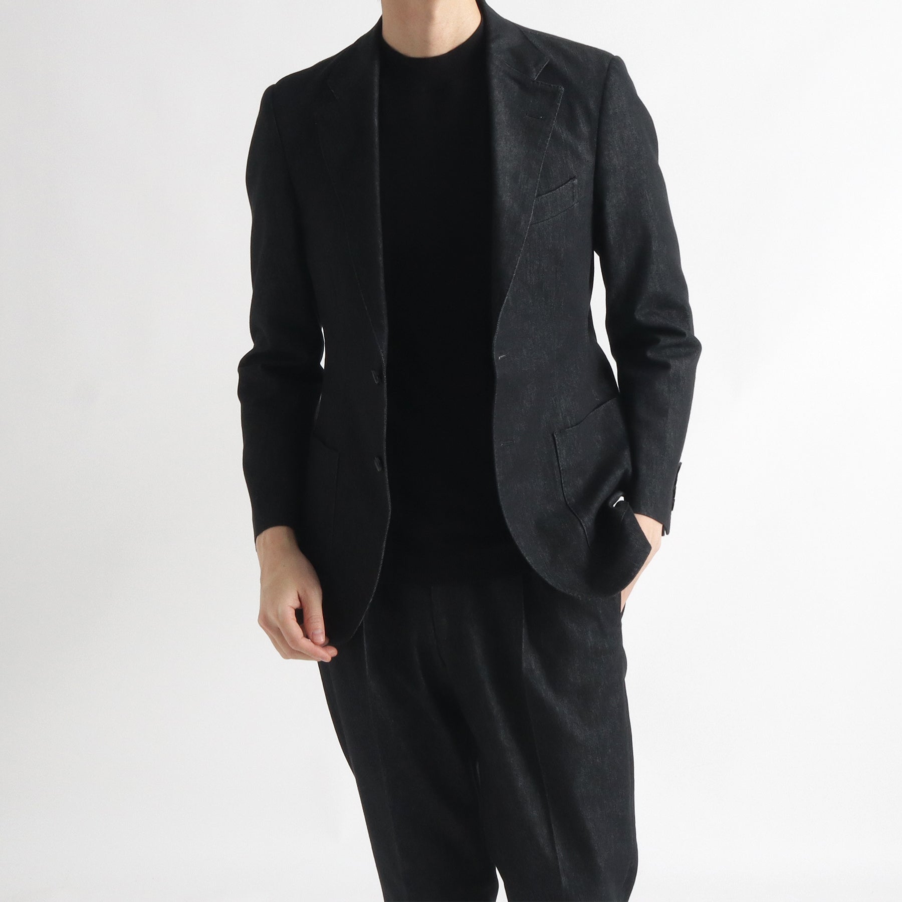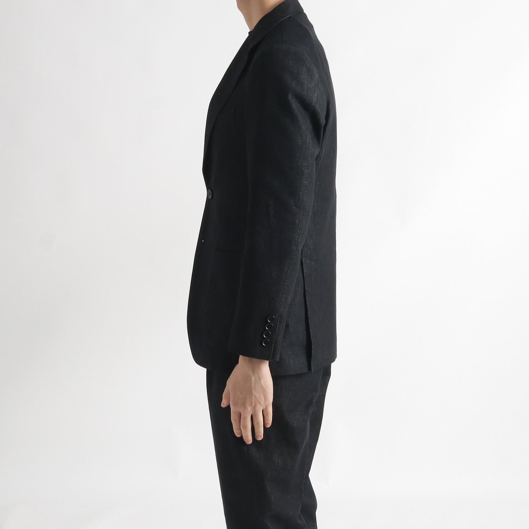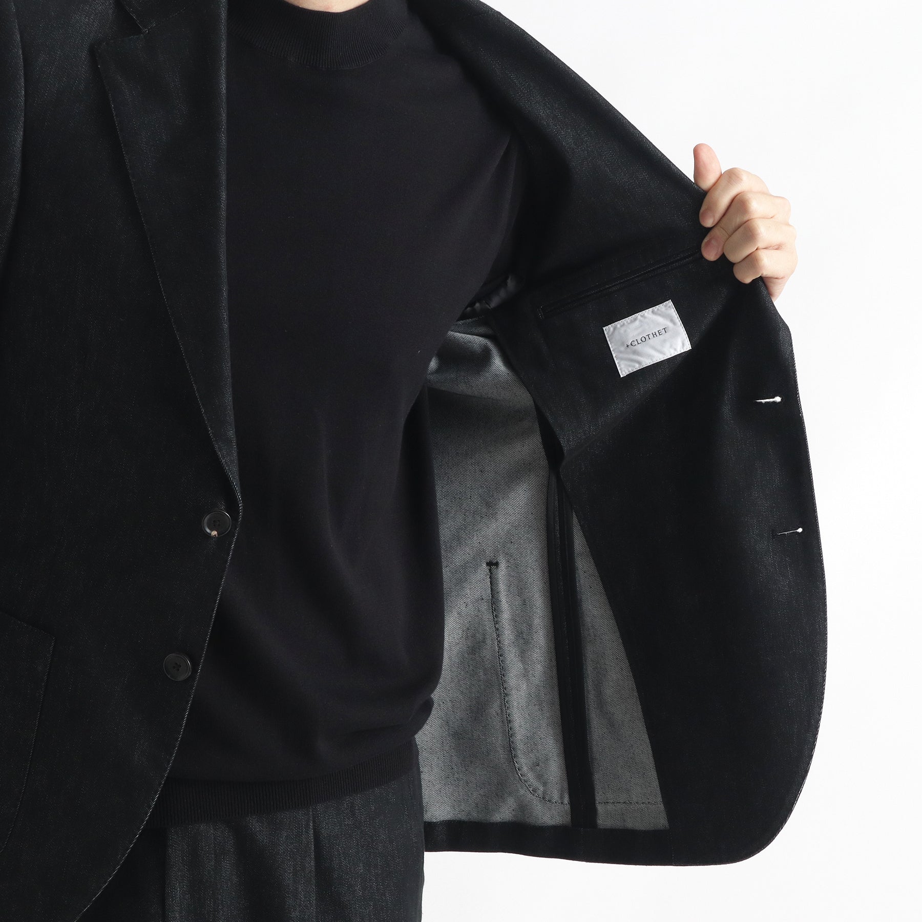 ラペルを広く取り、Vゾーンを狭くすることでクラシックなエッセンスがちりばめられたジャケットはボタンを留めた時の美しいシルエットだけでなく、前身頃を落として僅かに外側へ逃がすことによってボタンを外して着用した時にもシルエットがシャープに見えるように仕立てています。左袖開きには+CLOTHETであることを示す+マークが入っています。