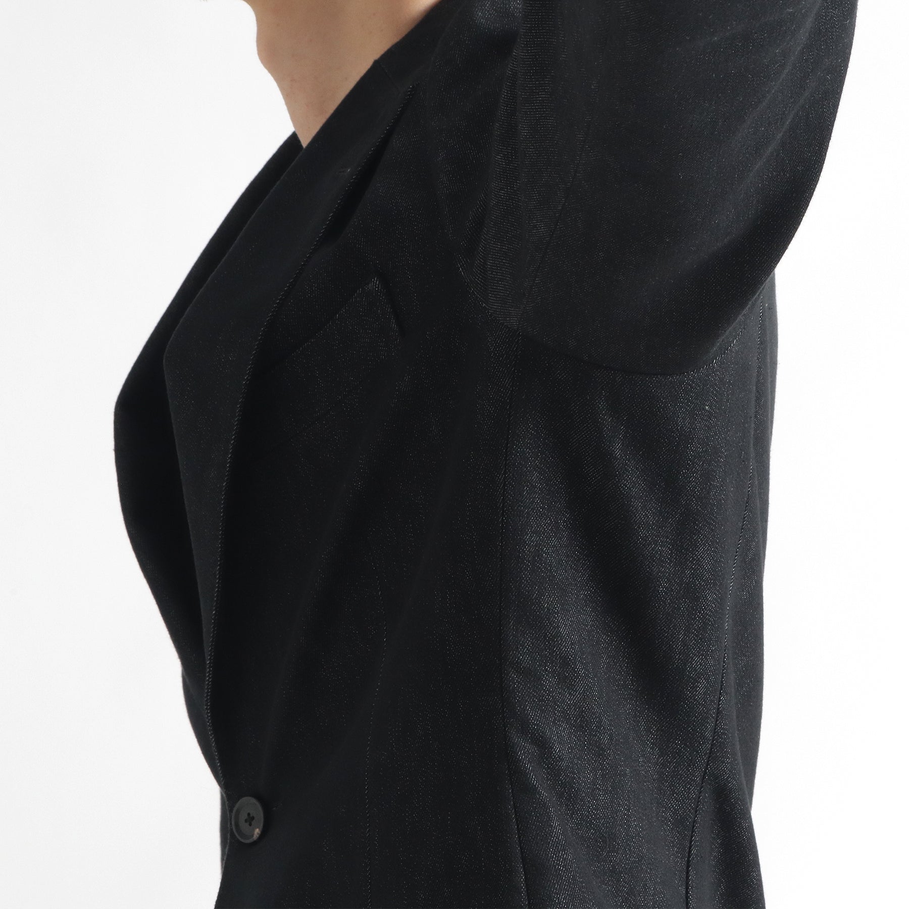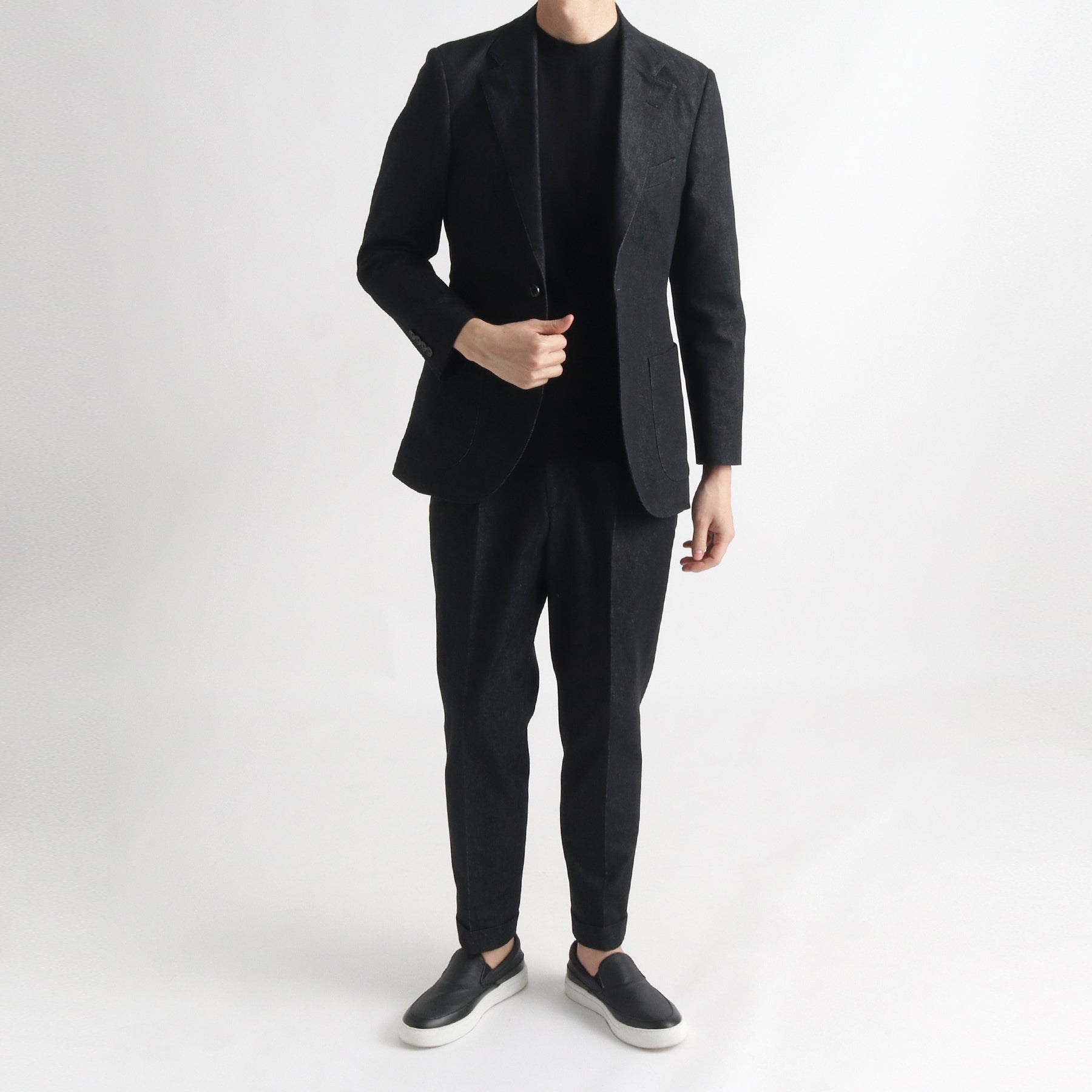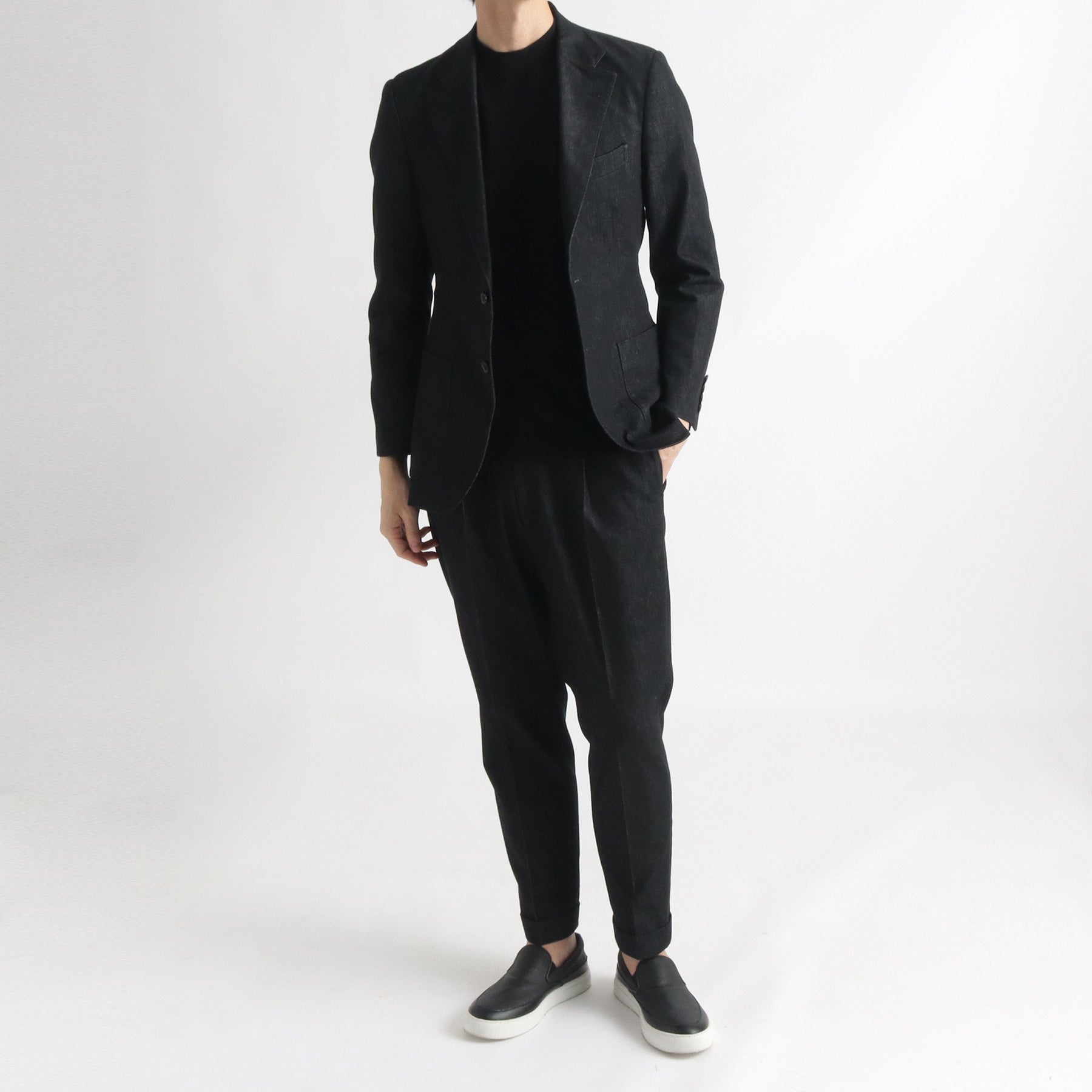 ラペルを広く取り、Vゾーンを狭くすることでクラシックなエッセンスがちりばめられたジャケットはボタンを留めた時の美しいシルエットだけでなく、前身頃を落として僅かに外側へ逃がすことによってボタンを外して着用した時にもシルエットがシャープに見えるように仕立てています。左袖開きには+CLOTHETであることを示す+マークが入っています。