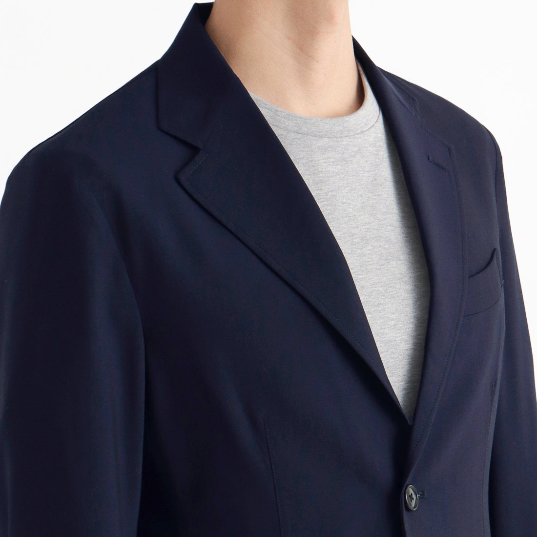 ラペルの広さ、ゴージの低さなどクラシックな表情や前身頃を少し外側に逃がすテクニックは残しつつ、シャツと同じ縫い目仕様にすることでカジュアルな雰囲気で軽い仕上がりに。
