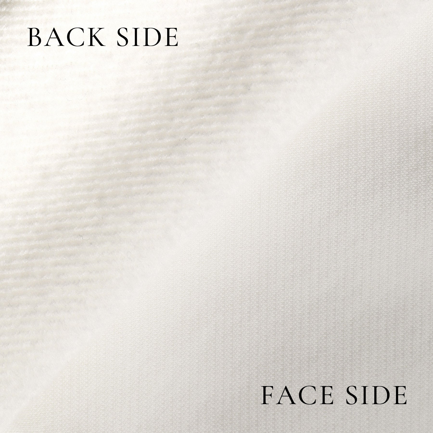 希少原料スビンプラチナムを表面、裏面ともに使用して完成した裏毛です。ハイゲージと呼ばれる32ゲージ裏毛編み機を採用、ソフトで膨らみが有り、かつ上品な艶、光沢の有る表情を生み出しています。また裏面を尾州産地で起毛することで、より生地の中に空気が含まれ柔らかさが増し、最高の肌触りを生み出しています。生地厚が増し、保温性を高める効果も発揮しています。