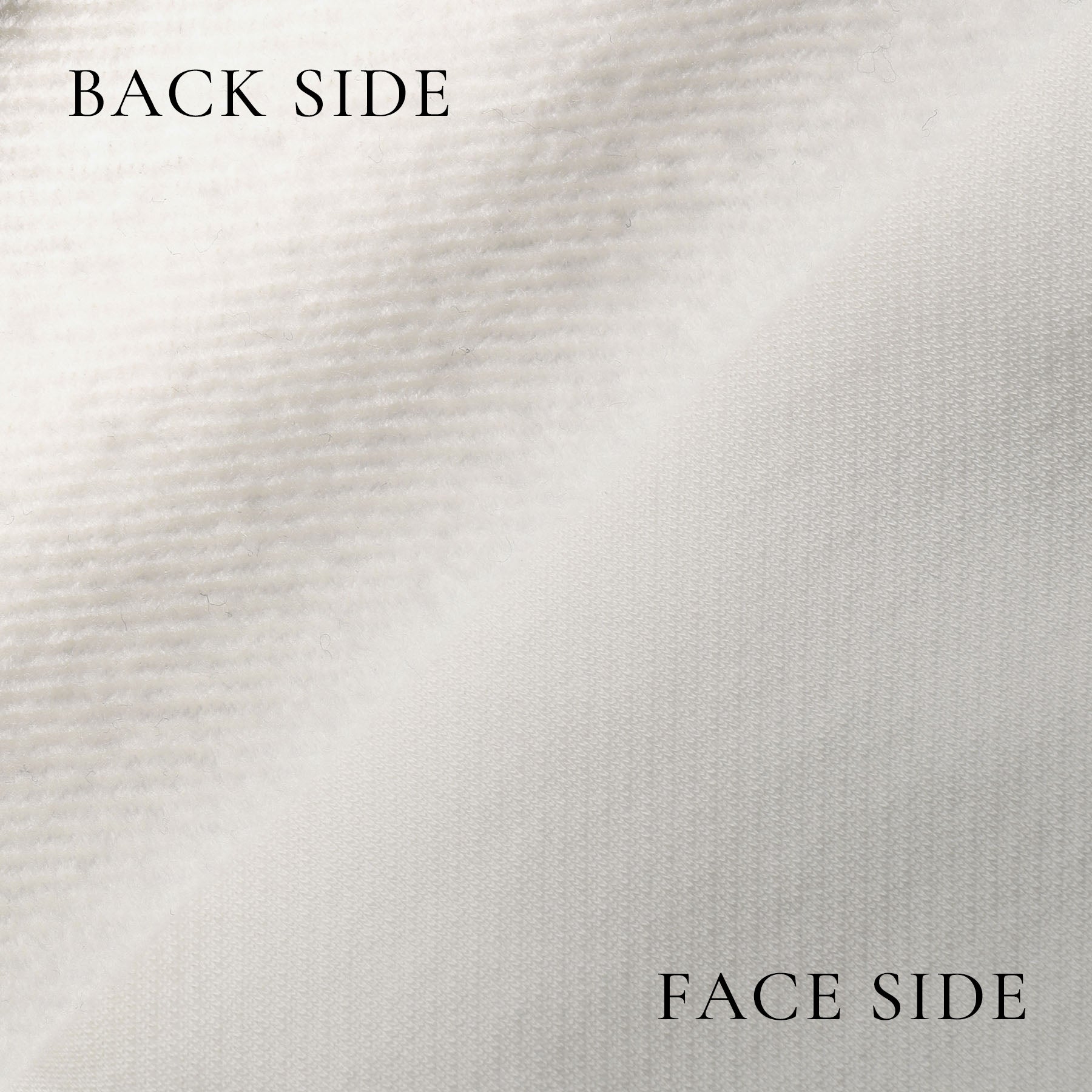 希少原料スビンプラチナムを表面、裏面ともに使用して完成した裏毛です。ハイゲージと呼ばれる32ゲージ裏毛編み機を採用、ソフトで膨らみが有り、かつ上品な艶、光沢の有る表情を生み出しています。また裏面を尾州産地で起毛することで、より生地の中に空気が含まれ柔らかさが増し、最高の肌触りを生み出しています。生地厚が増し、保温性を高める効果も発揮しています。
