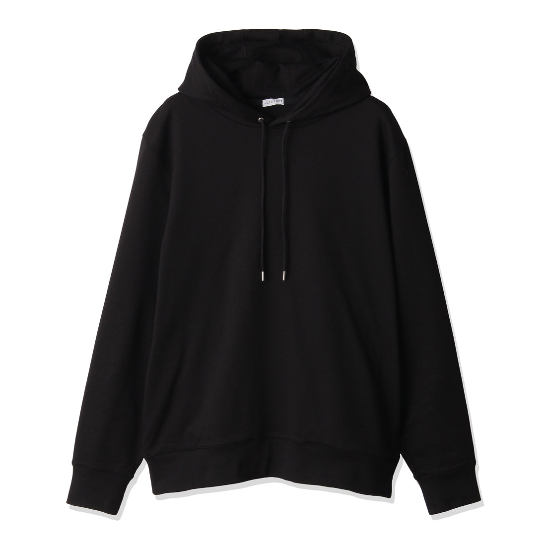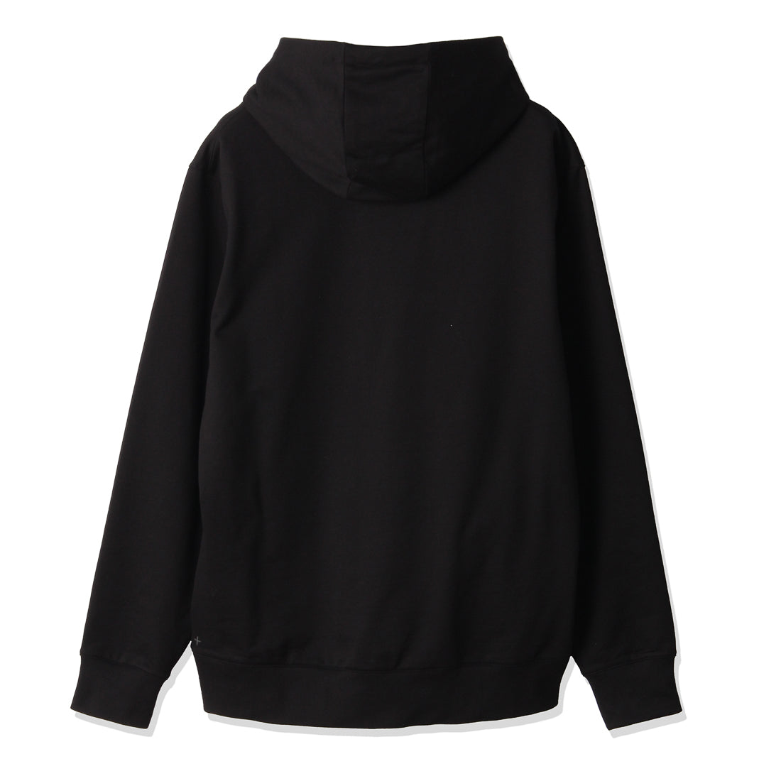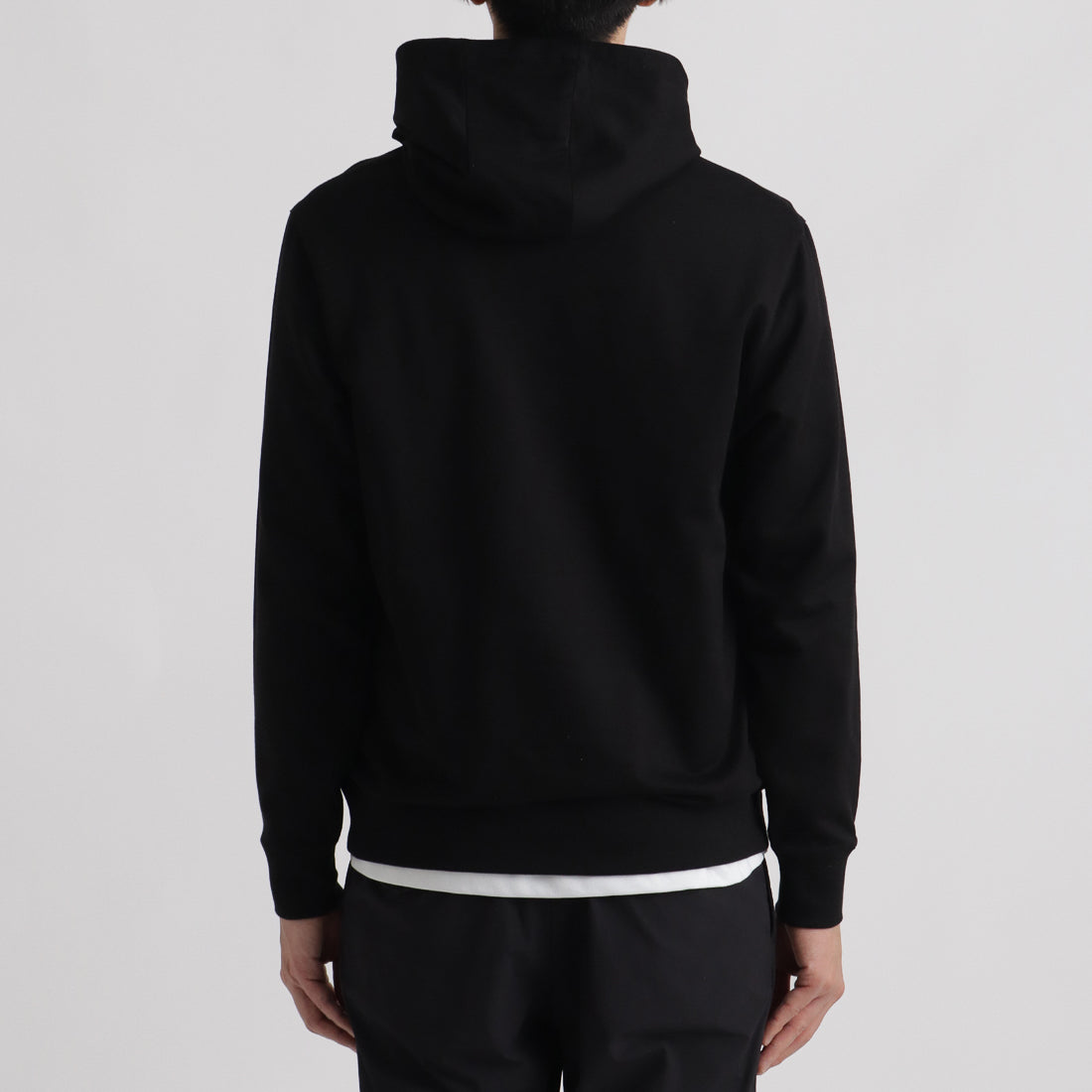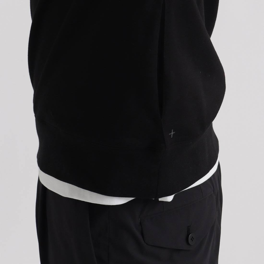 立体的に作られたアームホールに対して袖を前振りに設計。肩線を後にずらし、肩にイセを入れることで体に沿わせながら肩まわりの可動域を広げる設計となっています。フードもしっかりと立つように再度設計を見直しました。裏毛フーディーと同様に全体的にゆとりを持たせたサイズ感、また前身頃より後身頃の着丈を長くすることで身体を包み込むようなシルエットで上品な仕上がりになっています。
