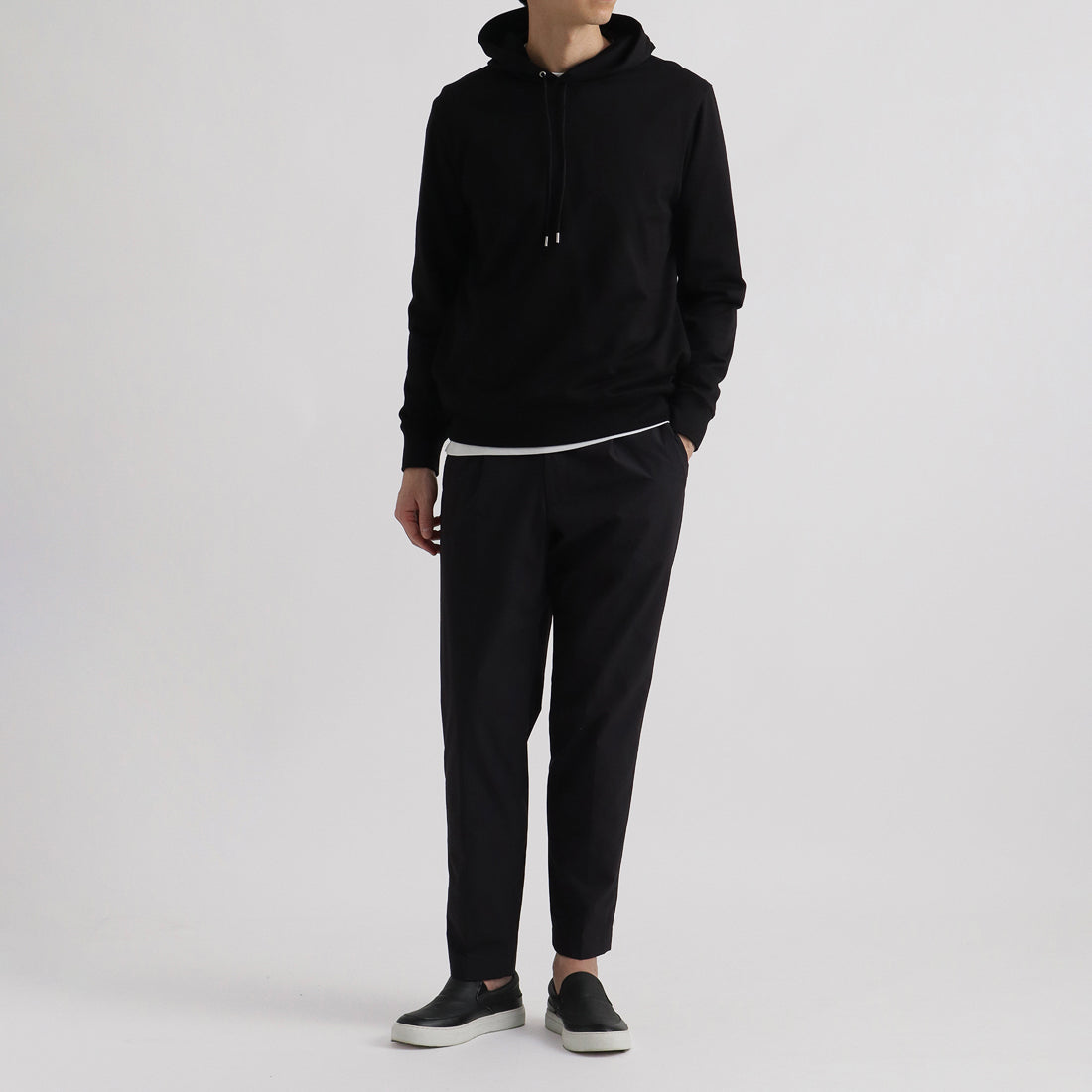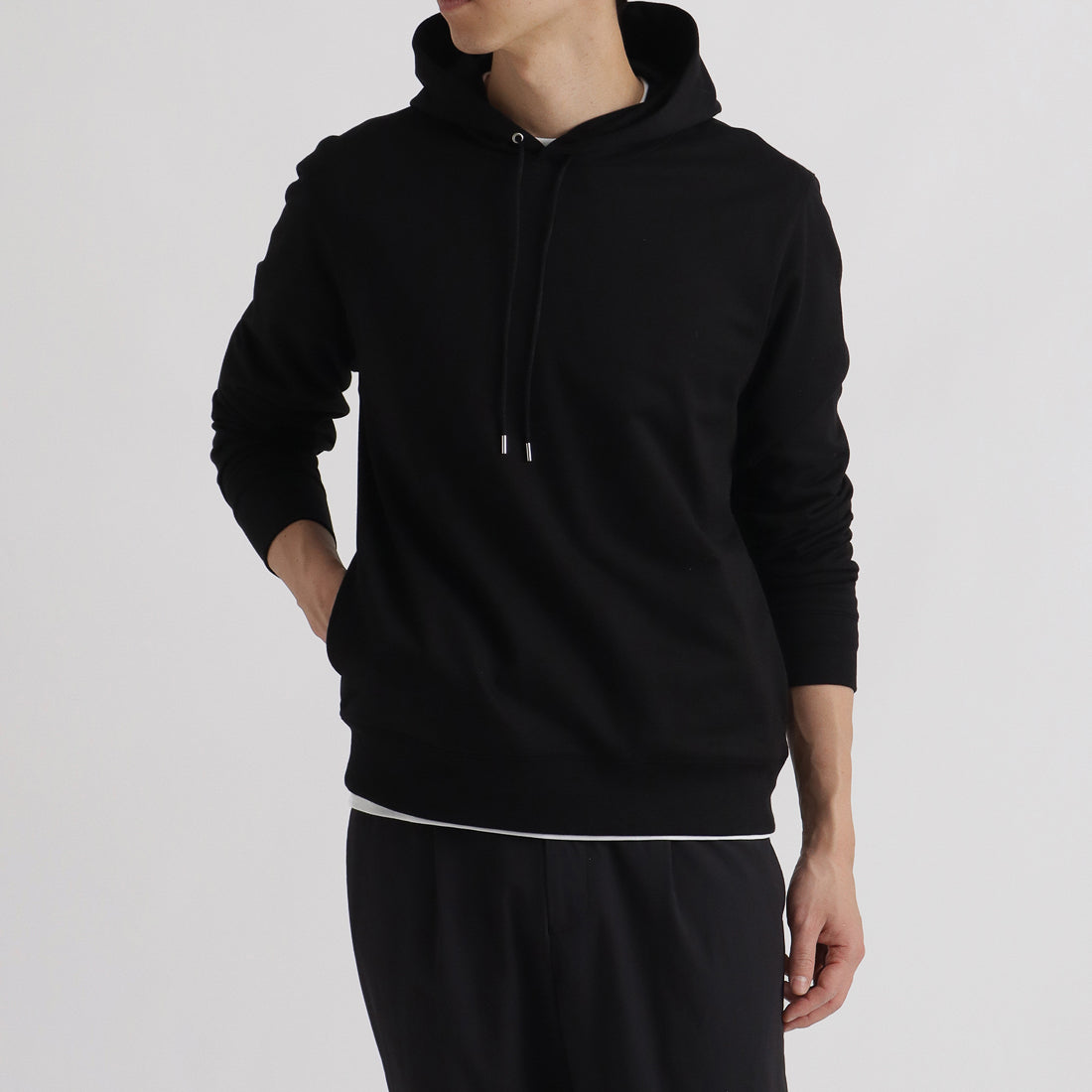 シーズンを問わずに活躍する人気素材「スビンプラチナムスムーステリー」を使ったフーディーが、この春リニューアルを果たしました。なめらかで上品な表面感と着心地の良さ、軽いアウターに最適な肉感で大変好評をいただいてきましたが、見えてきた課題やお客様の声を元に改良を重ね、ついに新型フーディーが完成いたしました。