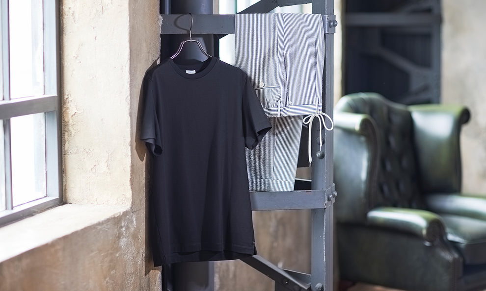 カジュアルアイテムながらドレスパンツの仕様を取り入れていることで上品な雰囲気をまとっています。スーパー140'sの原料の良さを感じる肌触りの良さや、Tシャツ 、襟付きシャツ、ニットと合わせるトップスを選ばない万能性もあります。ニットTやポロなどニットアイテムをトップスに、靴はローファーやドライビングシューズと合わせることでホテルやレストランでも対応可能な上品なドレスカジュアルスタイルの完成です。