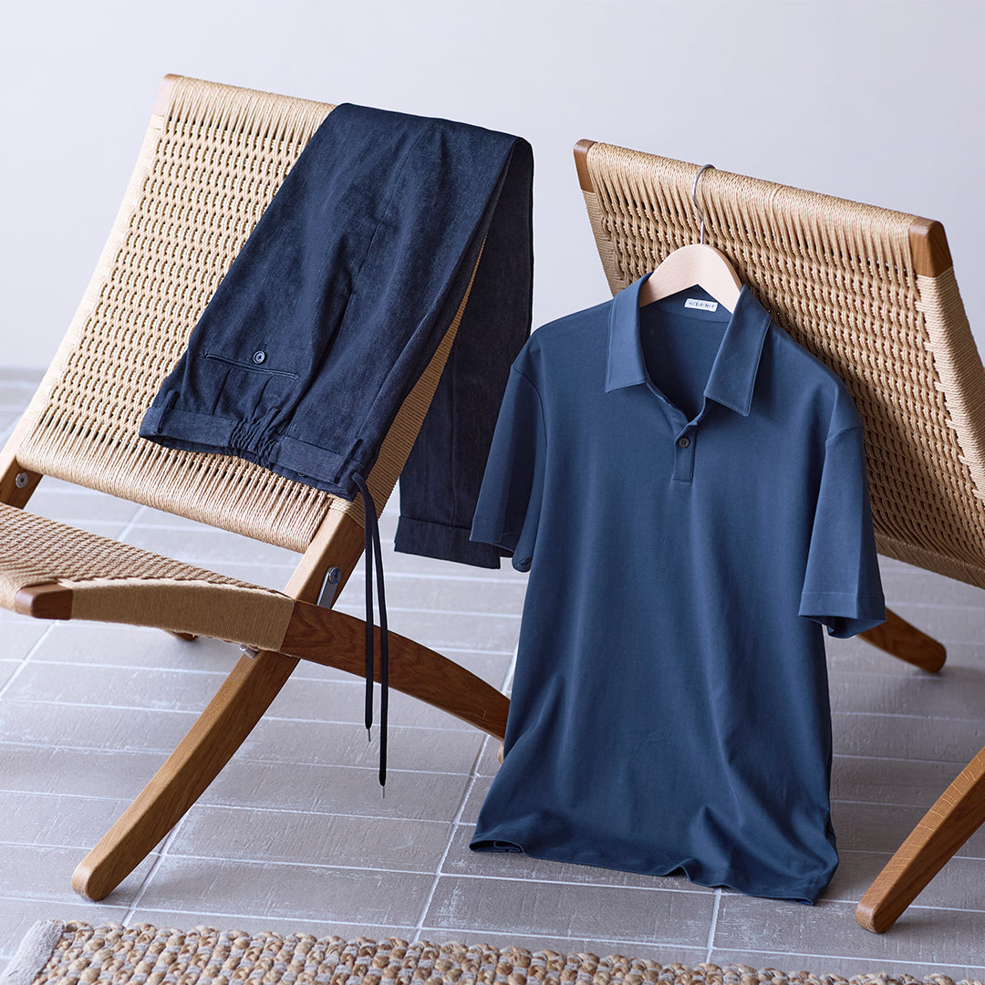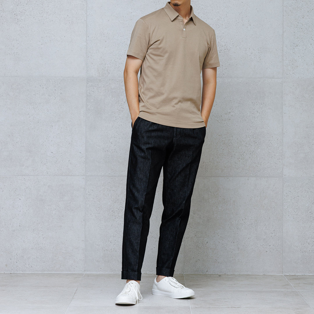 トップス:Tailored Polo-shirt ボトムス:Reactive Denim Easy Trousers