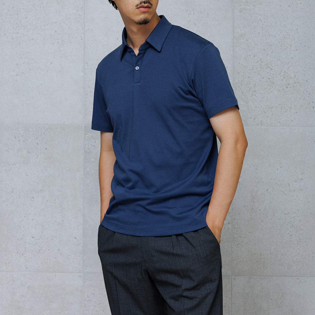ブルー系カラーの「マリーン」のテーラードポロシャツは、全体をトーンオントーンでまとめることで、爽やかなスタイリングにすることができます。少しくすみ感のあるマリーンカラーは鮮やかすぎない上品な色合いが特長で、夏はもちろん、秋の装いにもぴったりです。