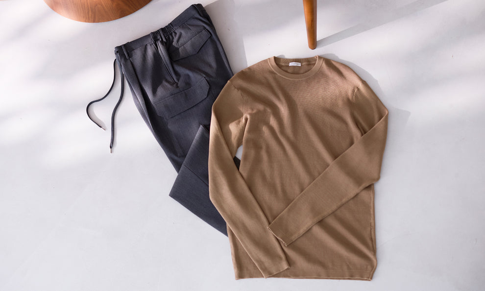 カジュアルな印象が強いサーマルもニットで成形、裾口や袖口のリブを細く、さらにひとつひとつの目を細かくすることで上品で大人な雰囲気に仕立てています。