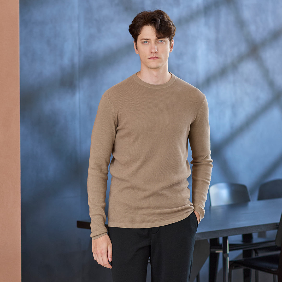 繊細な凹凸が魅力のミニサーマルニットに、新色モカが登場しました。グレーがかったベージュトーンとミニサーマル特有の組織が、コーディネートのアクセントになるおすすめのカラーです。通常のサーマルよりも表面が細かく仕上がっているため、上品に着こなせるのもポイントです。