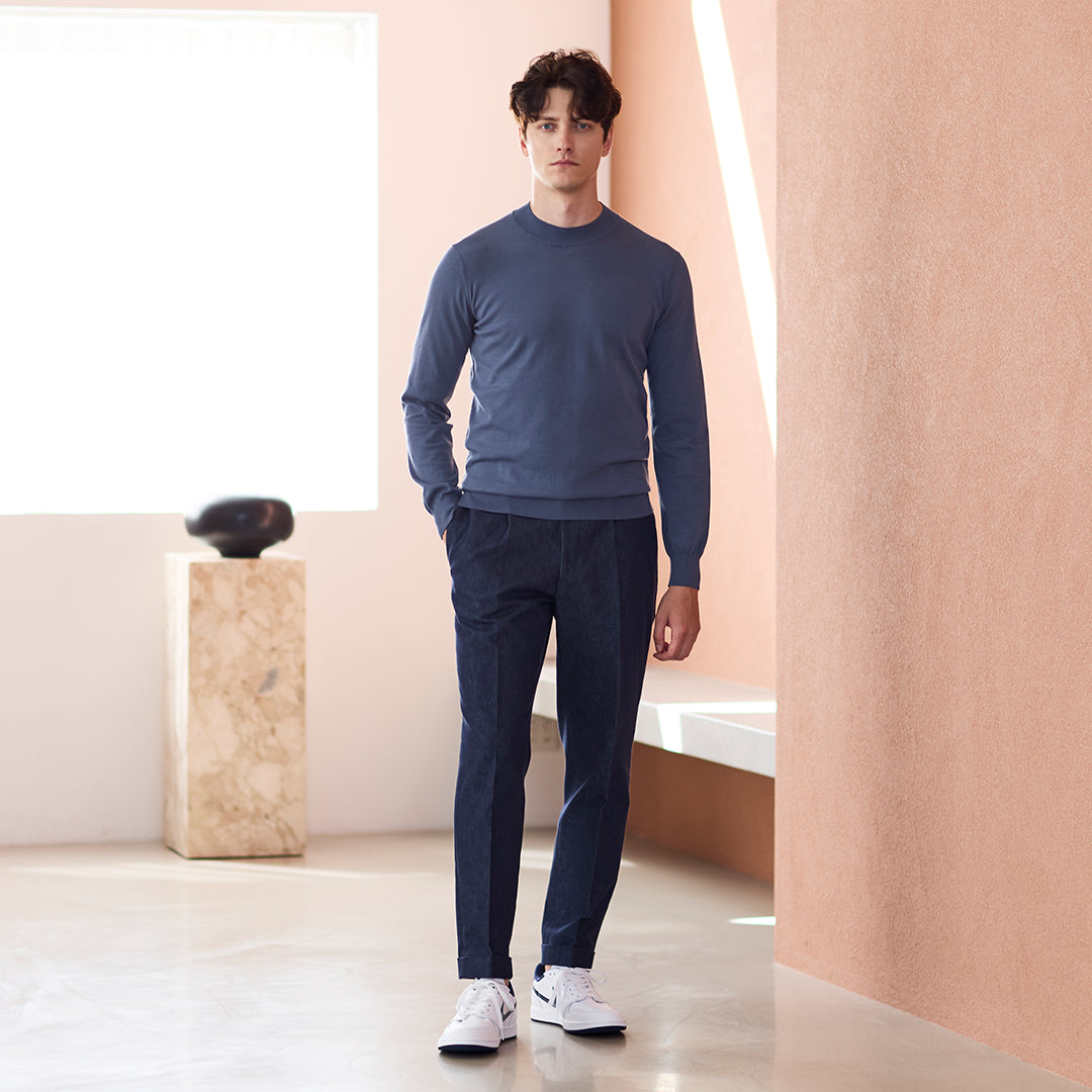 深みのあるグラファイトブルーのモックネックニットとリアクティブデニムのトラウザーを組み合わせることでカジュアルさとエレガンスを両立させたスタイルにすることができます。