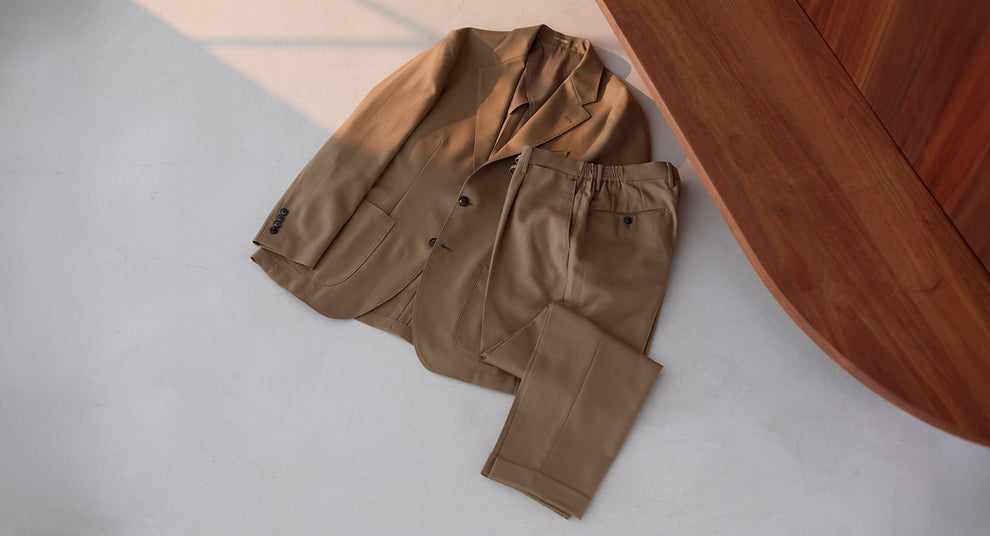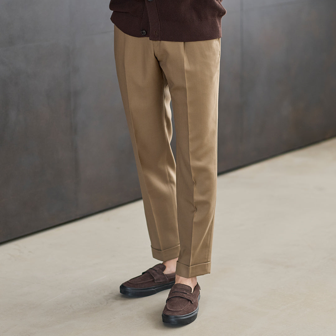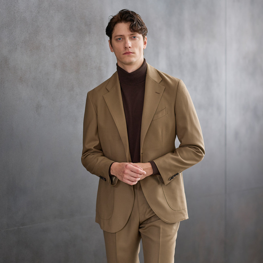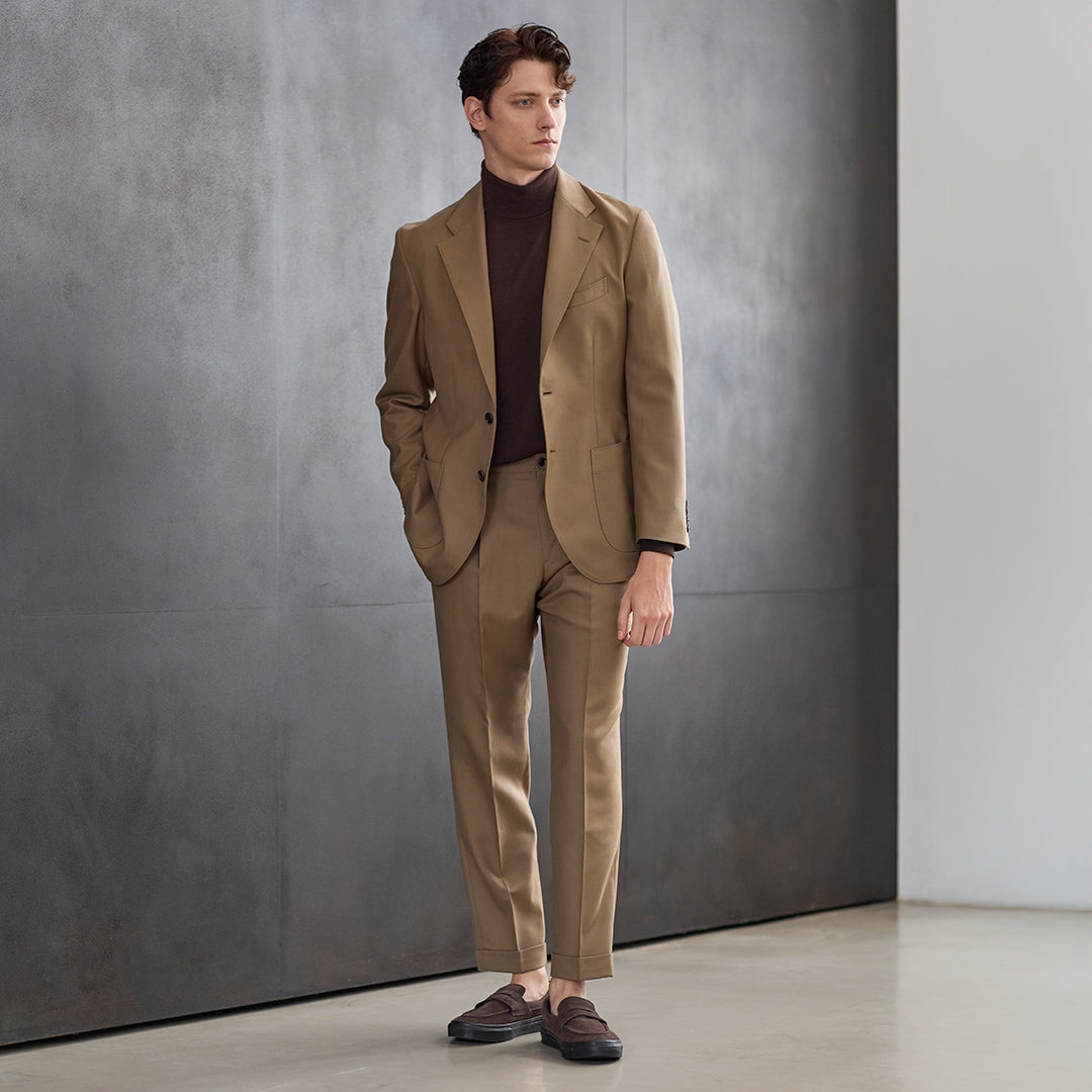 キャメルのセットアップとオークカラーのタートルネックのコーディネート。オークカラーのような同系色のインナーを合わせることでマイルドなルックスかつ、トーン違いの洗練されたアンサンブルにすることができます。さらにアイテムをタートルネックやモックネックにすることでエレガントな雰囲気も付与することができます。
