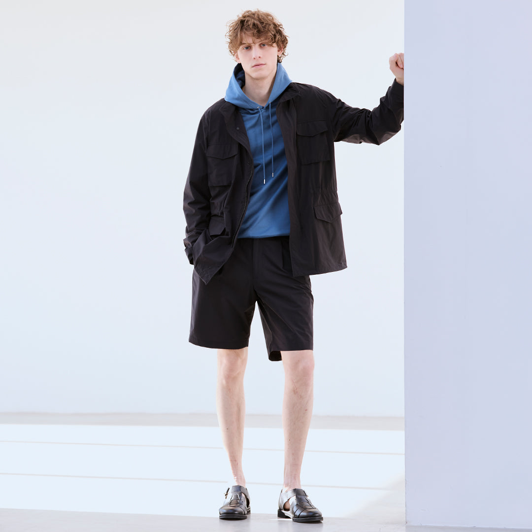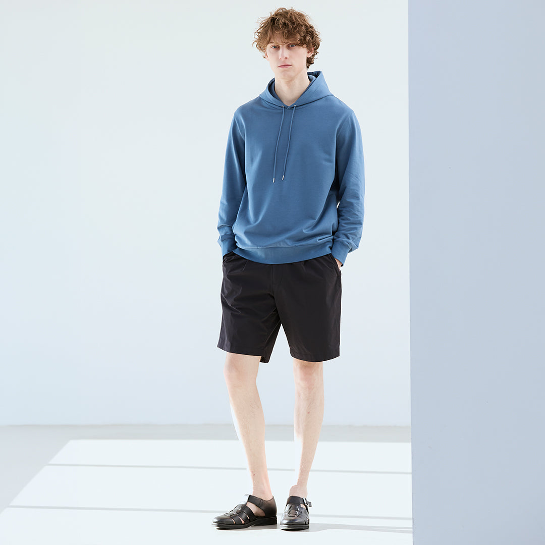 ジャストよりややゆとりを持たせた「グラファイトブルー」のフーディーがリラックスした印象を持たせつつ、ブラックのショートパンツで全体を引き締めながら、クリーンな印象に仕上げています。