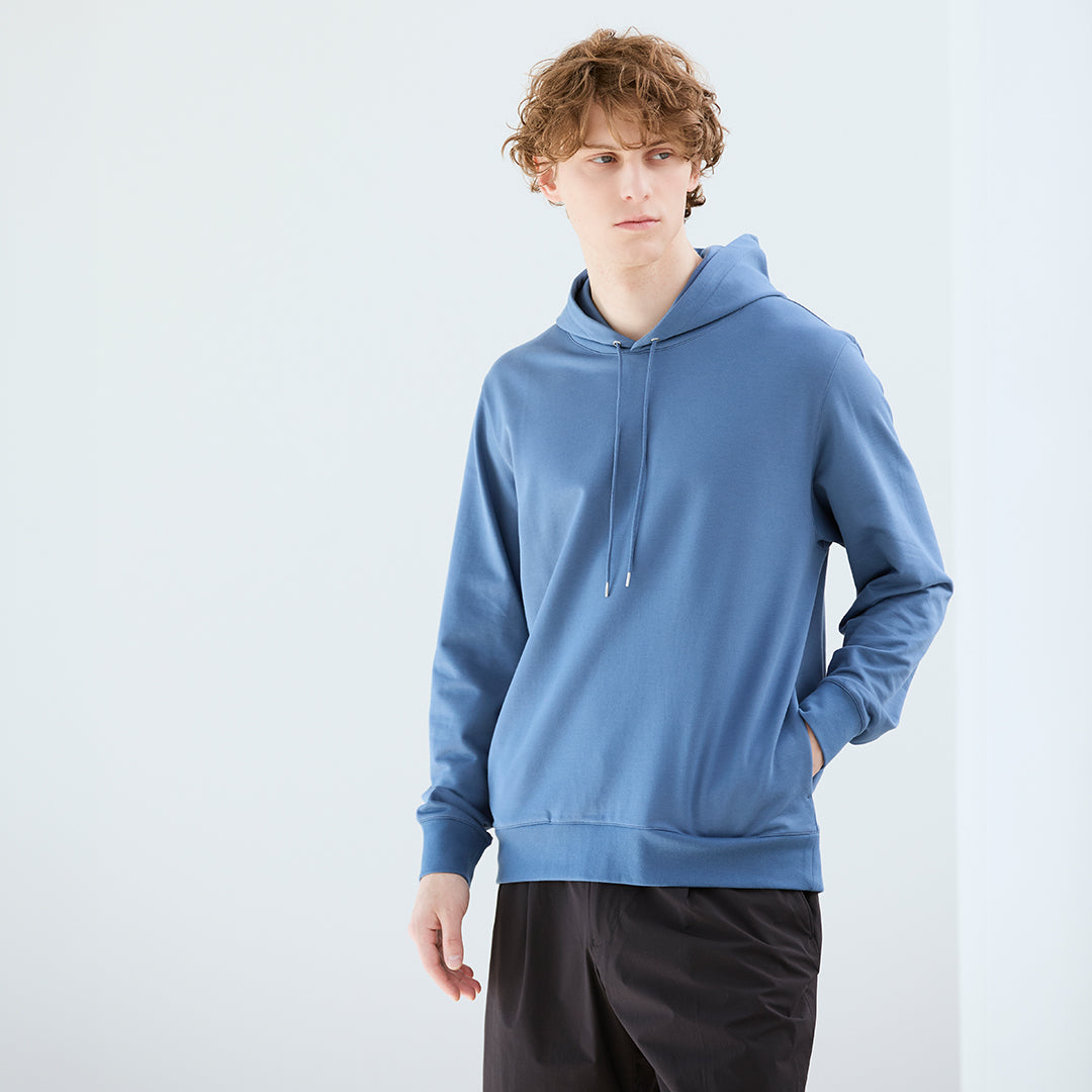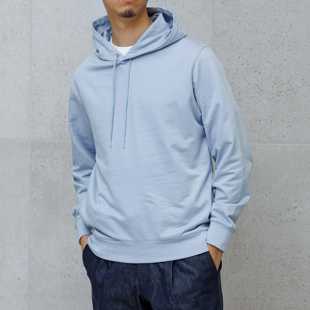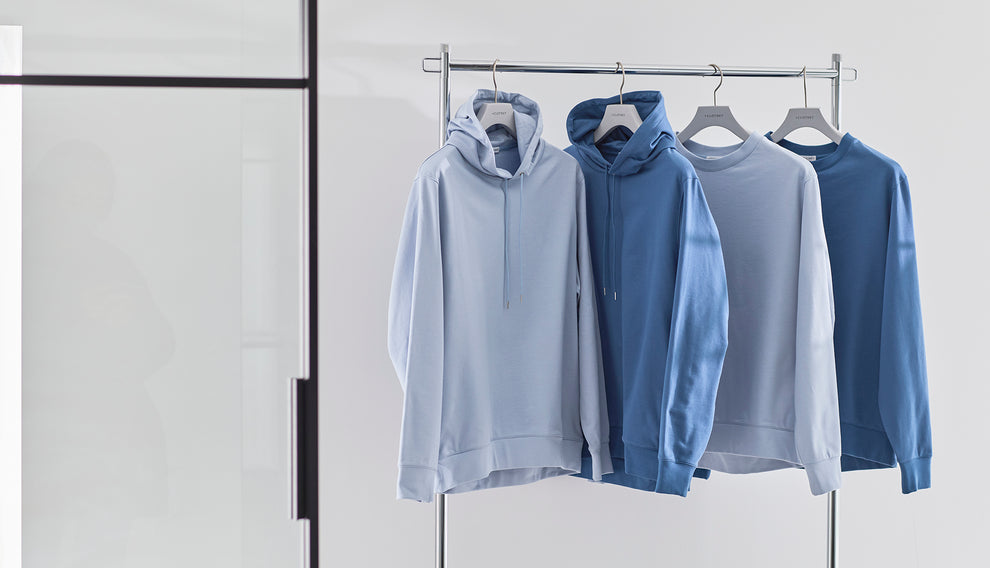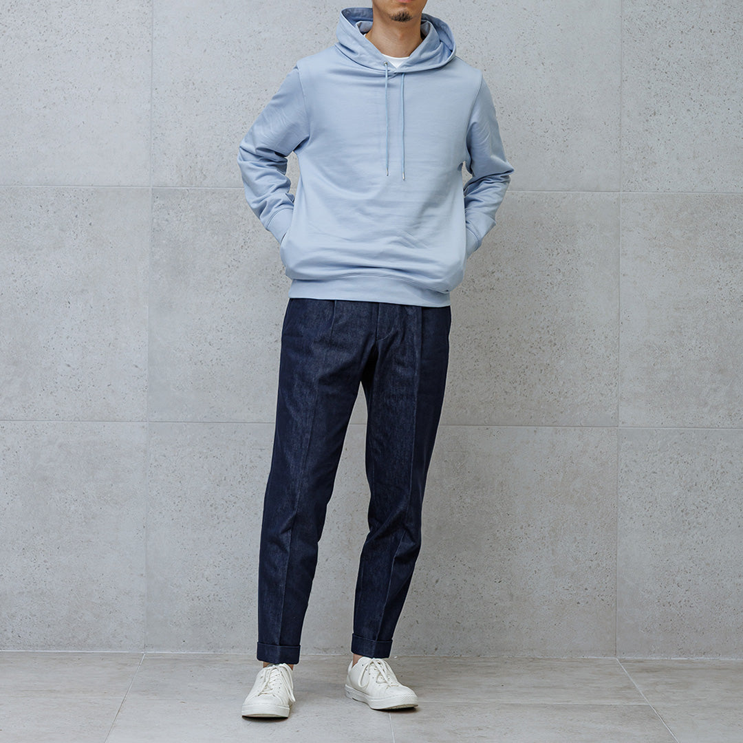 柔らかな雰囲気を持つ「スカイ」のフーディーで軽やかさと抜け感をつくり、リアクティブデニムのトラウザーが全体を引き締めています。トラウザーと合わせることでカジュアルながらも品の良さを感じさせるコーディネートに仕上げることができます。