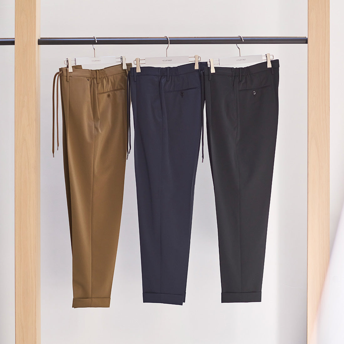 マットツイストを除く、本ページでご紹介したトラウザーとセットアップ可能なジャケットは、3月下旬より発売予定です。