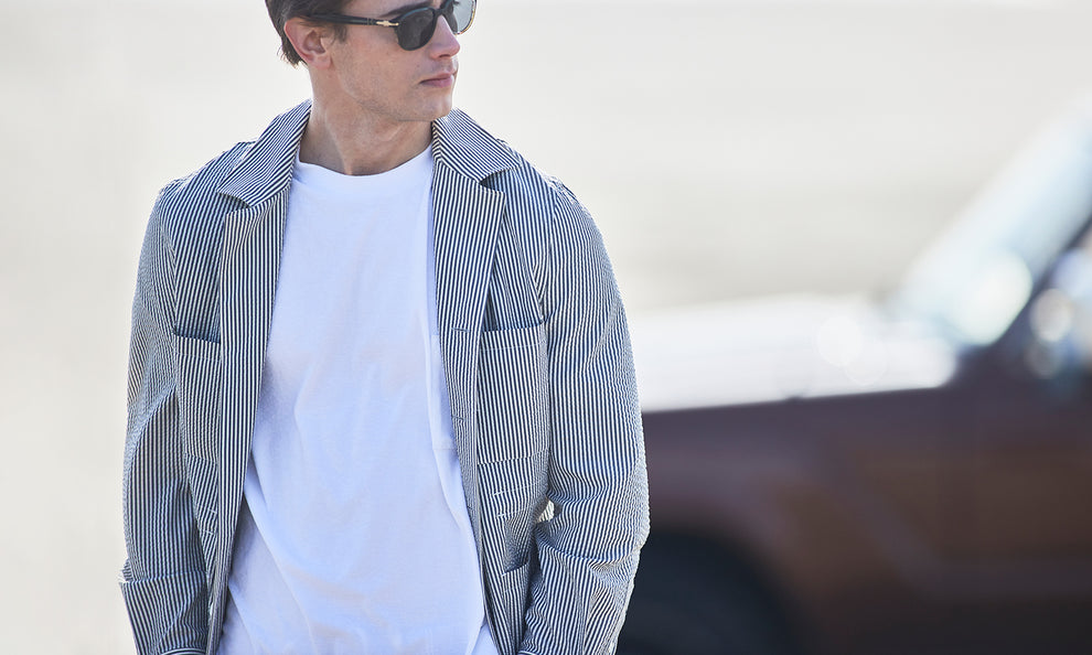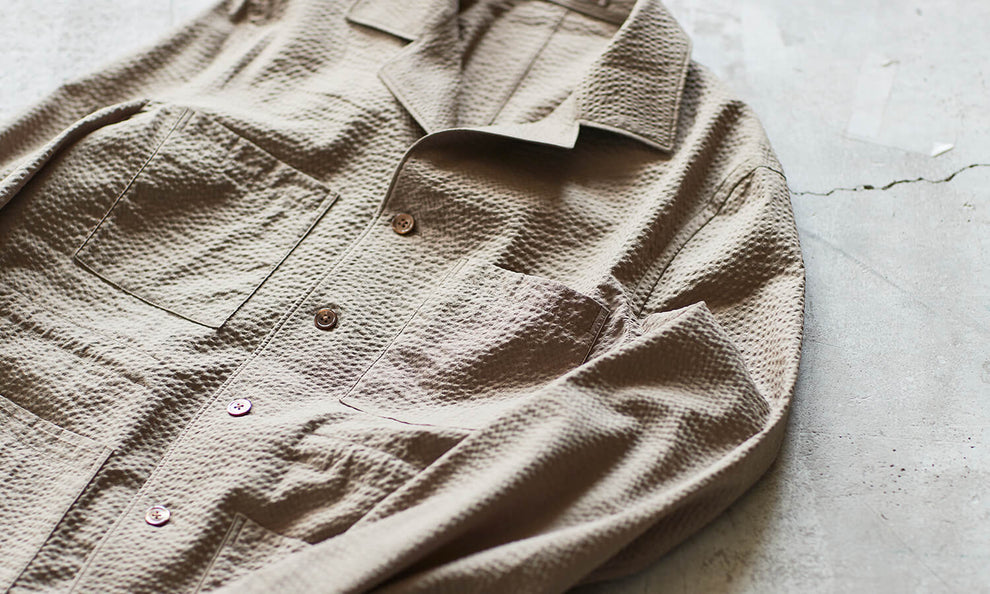 インパクトの強いシアサッカーもカジュアルなテイストに落とし込むことで使い勝手のよいアイテムに。