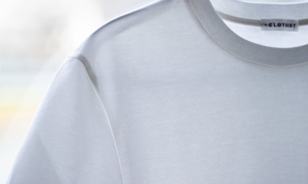 また首元部分のフライス(首元の伸縮性のある編地)もスビンシルクで作成するこだわりよう。