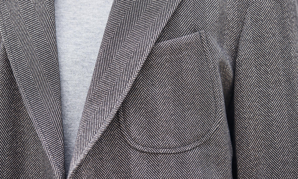 ラペルを広く取り、ゴージラインも低めに設定したVゾーンが狭めのクラシカルなデザイン。テクニカルな素材に対してディテールはクラシックな表情に仕立てています。