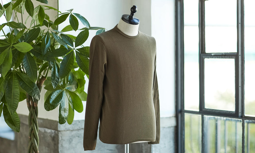 ニットではほとんど取り入れられない袖の前振りを採用。ベーシックだからこそ人体のラインにこだわったクルーネック。袖口と裾のリブ部分は細くすることで上品な仕上がりに。シンプルでベーシックなデザインはオンオフ問わずにスタイリングしやすい一着。