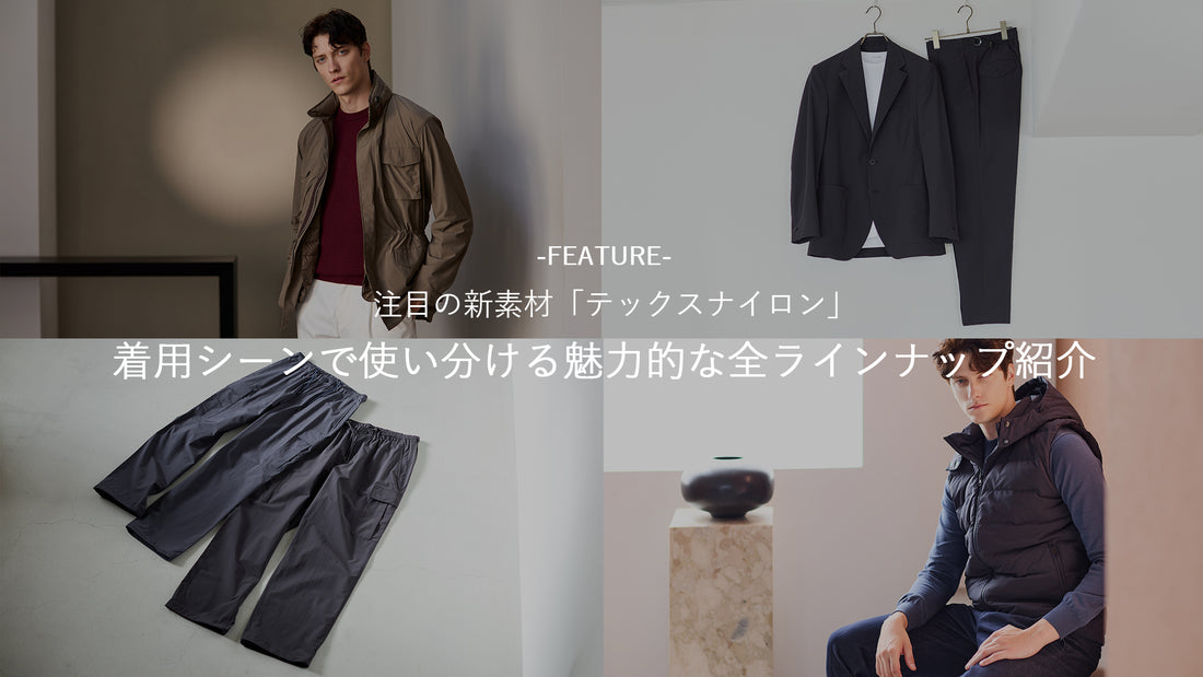 今年の春に登場し、秋冬にかけてアイテムが増えた「テックスナイロン」素材の全アイテムをご紹介。2wayストレッチで快適に、薄手ながらしっかりシルエットを形成するのでオールシーズンに活躍する素材です。