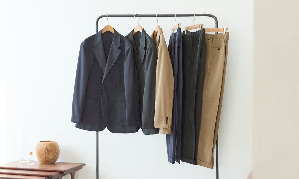 新開発素材「モアザンコットン」を使用したセットアップが登場です。名前の通り「コットンを超える」というテーマで作られた生地を使用し、テーラードジャケットとイージートラウザーが完成しました。コットン生地の懸念点であるシワや経年劣化による色落ちを軽減し、自然な風合いをポリエステルで表現しました。クラシック且つ上品な印象のセットアップです。