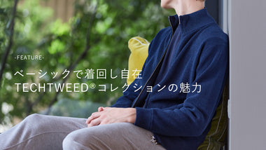 当ページでご紹介のスビンプラチナムニットとは全く異なる特長を持つテックツイード®シリーズ。今回は素材の特長からデザインのポイント、スタイリングまで詳しくご紹介します。