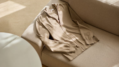 「生地をよく見ていただくと、かすかなシボのような立体的な表情があるのがわかると思います。このシボ感は糸を整経※する段階でフラットにしてしまうこともできるんですが、あえて残すという選択をしているのがポイント。これが抜群の肌離れの良さや、リッチな風合いにつながっているんです」