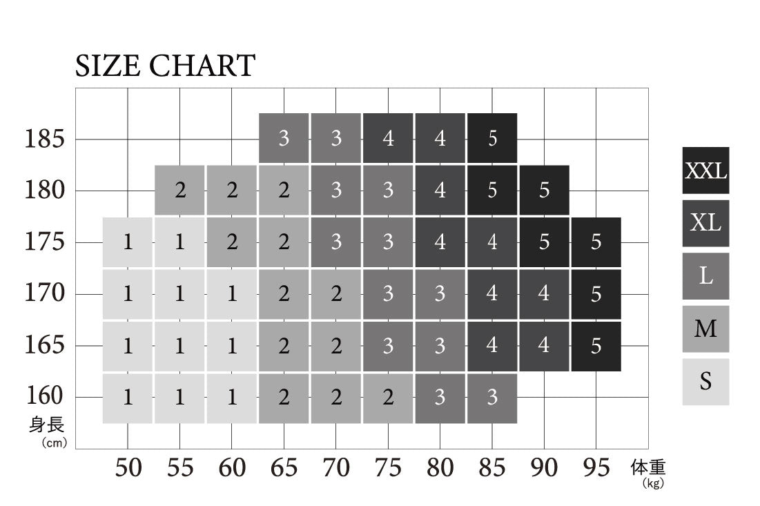 | Size | 1(S) | 2(M) | 3(L) | 4(XL) | 5(XXL) |