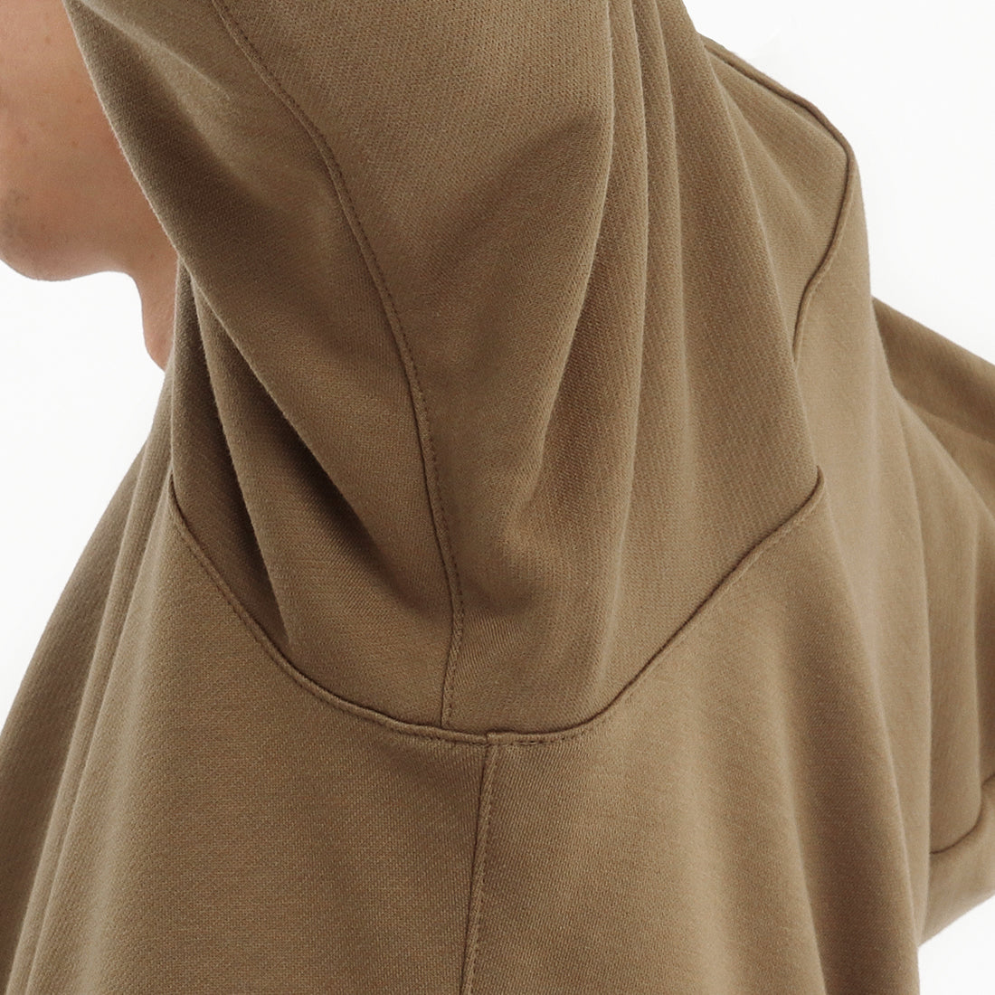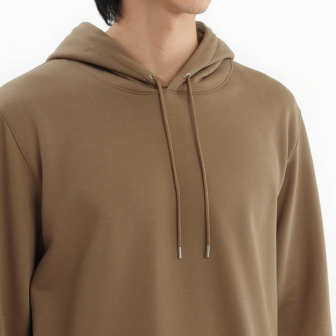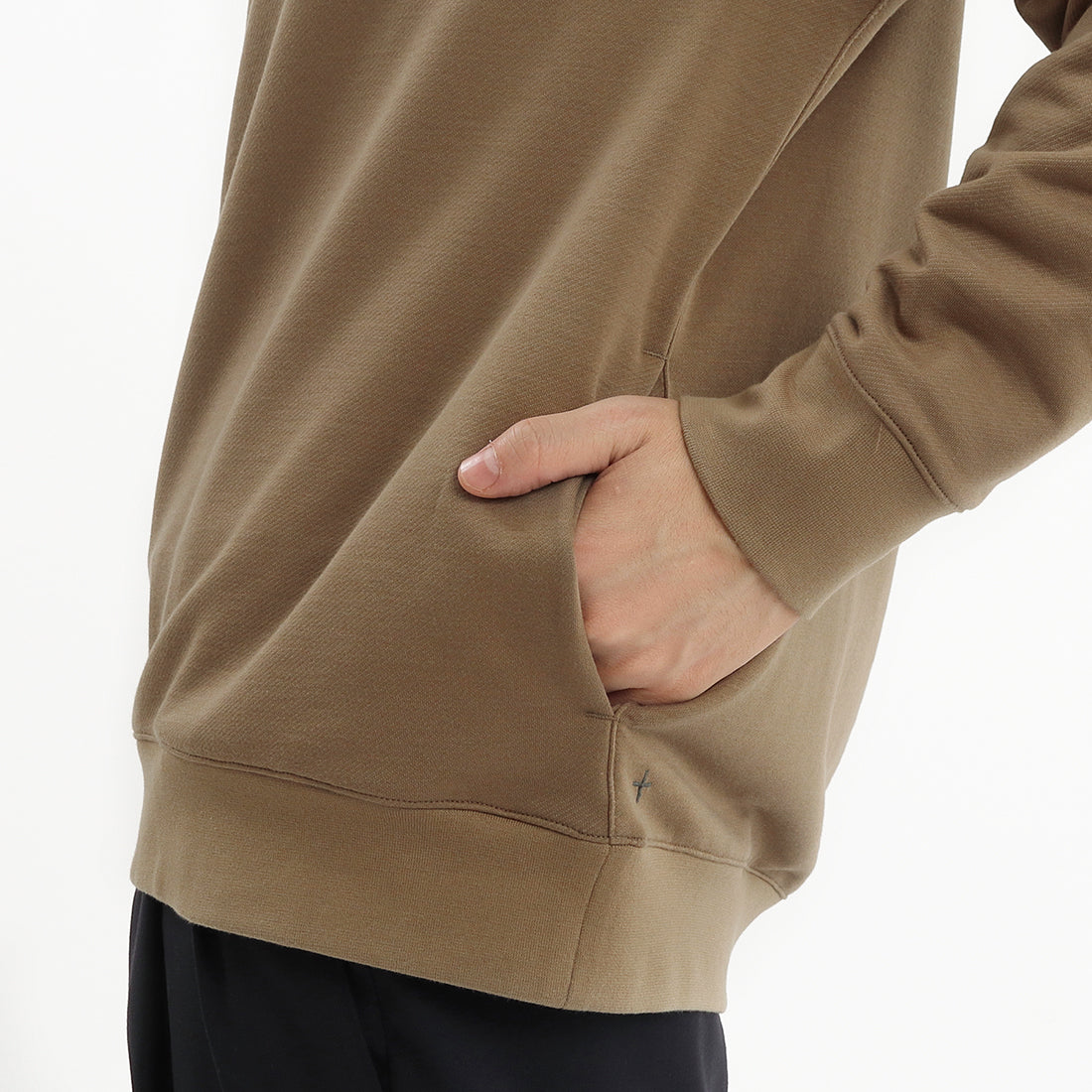 今までの+CLOTHETのプルオーバーのフーディーより全体的にゆとりを持たせたサイズ感、また前身頃より後身頃の着丈を長くすることで身体を包み込むようなシルエットで上品な仕上がりになっています。