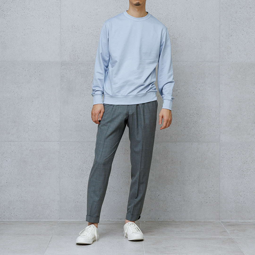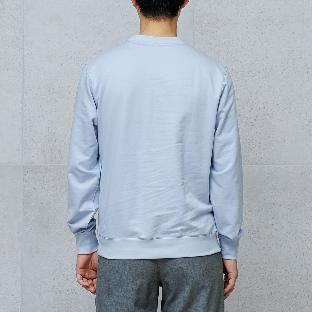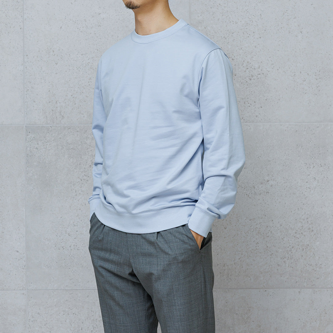 シーズンを問わずに活躍する人気素材「スビンプラチナムスムーステリー」を使ったスウェットシャツにスカイが新登場しました。なめらかで上品な表面感と着心地の良さ、軽いアウターに最適な肉感で大変好評のアイテムです。